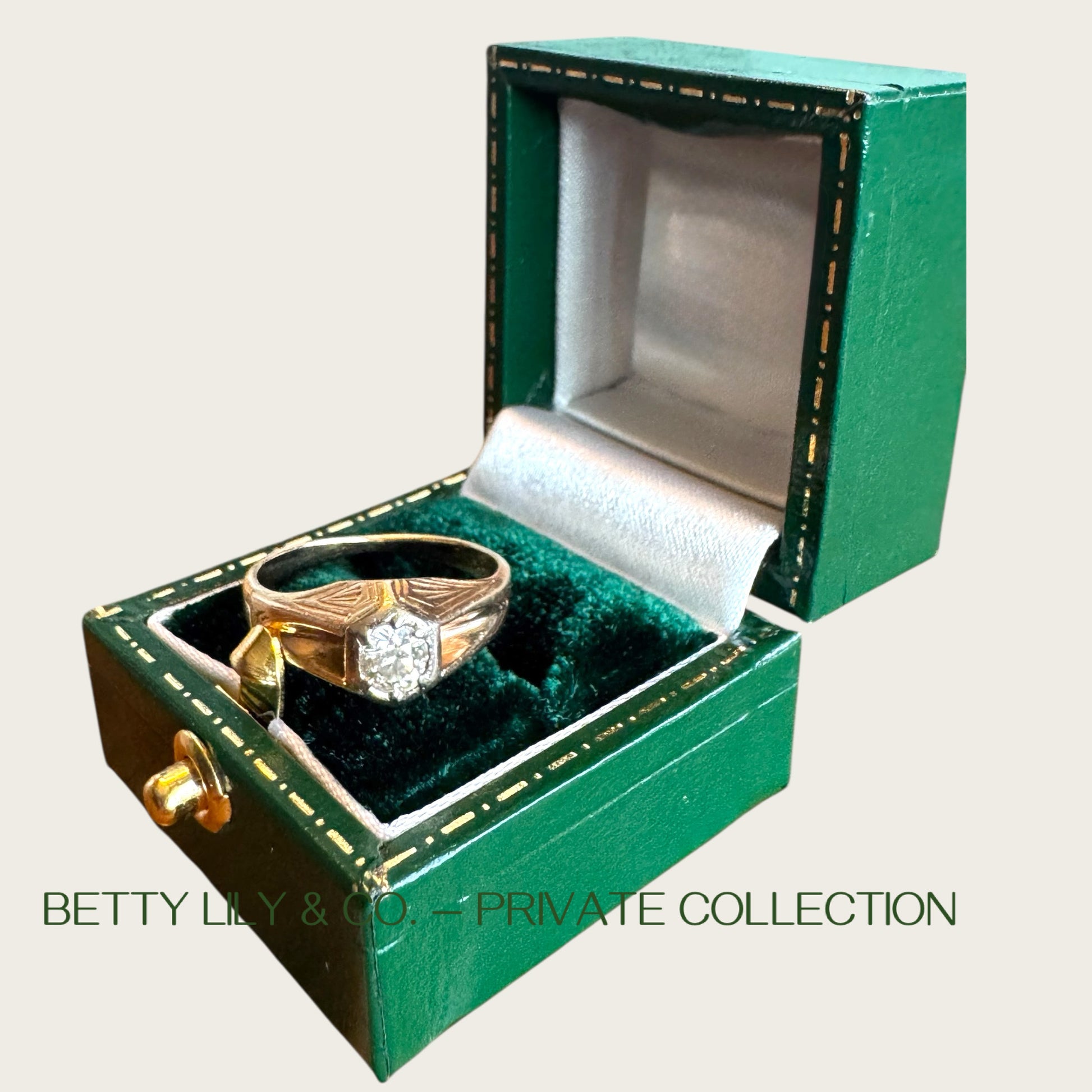 This ring combines both intrinsic and collectible value — a natural diamond of substantial weight in solid gold, enhanced by a geometric Art Deco design that remains highly sought after.