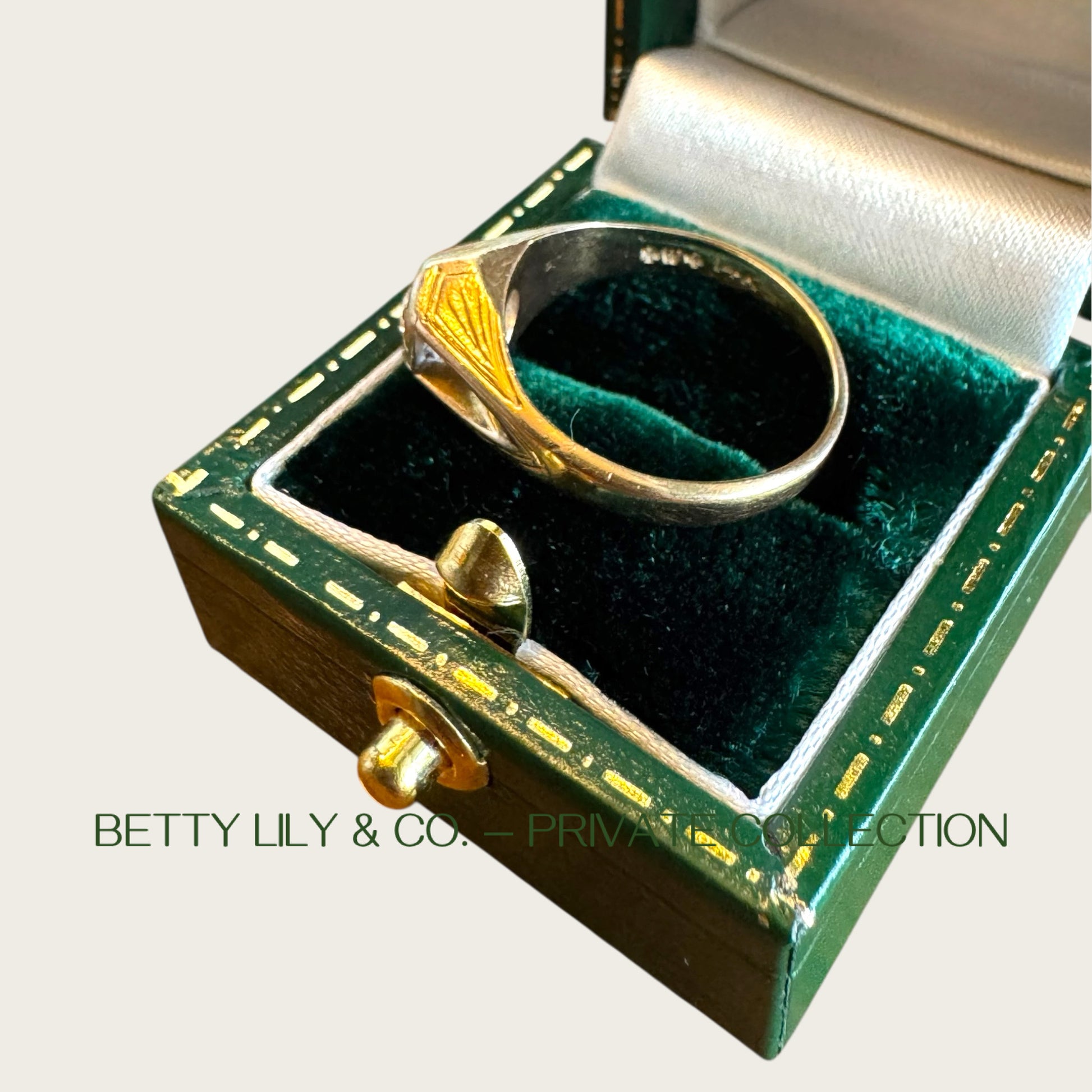 The inner band is stamped 14K alongside the maker’s mark WWP, attributing the piece to a distinguished jeweler of the era. Substantial in weight at 3.92 grams and sized to fit approximately 6 ¾, this ring was originally crafted in the style of a gent’s ring, yet its striking geometry makes it a versatile statement piece for any wearer today.