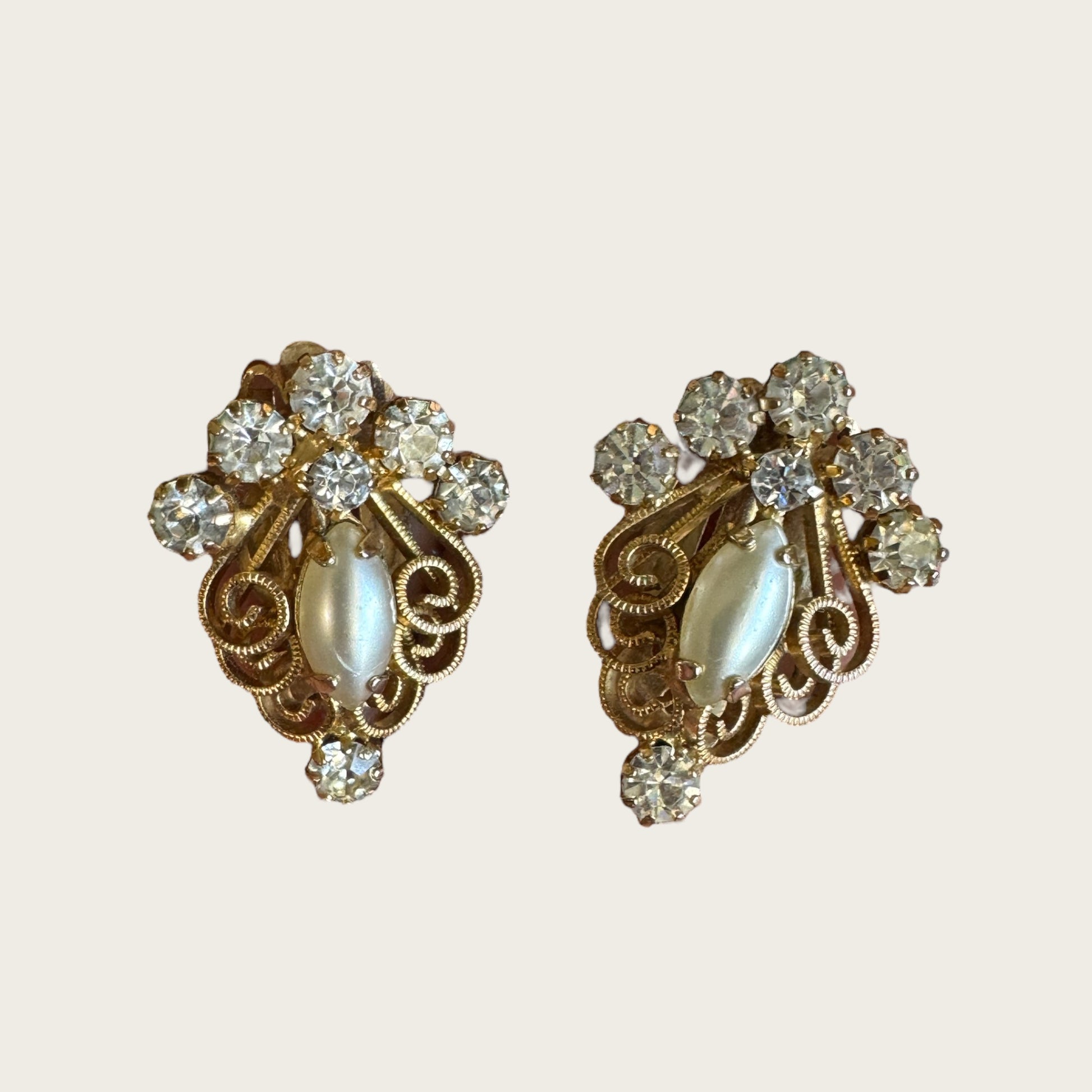 A beautifully preserved mid-century demi-parure from Hope Chest, showcasing the soft grandeur of 1950s–1960s costume jewelry design. This luminous set pairs navette-shaped faux pearls with sparkling crystal rhinestones, all framed in scrolling, openwork gold-tone filigree that speaks to the era’s romantic elegance.