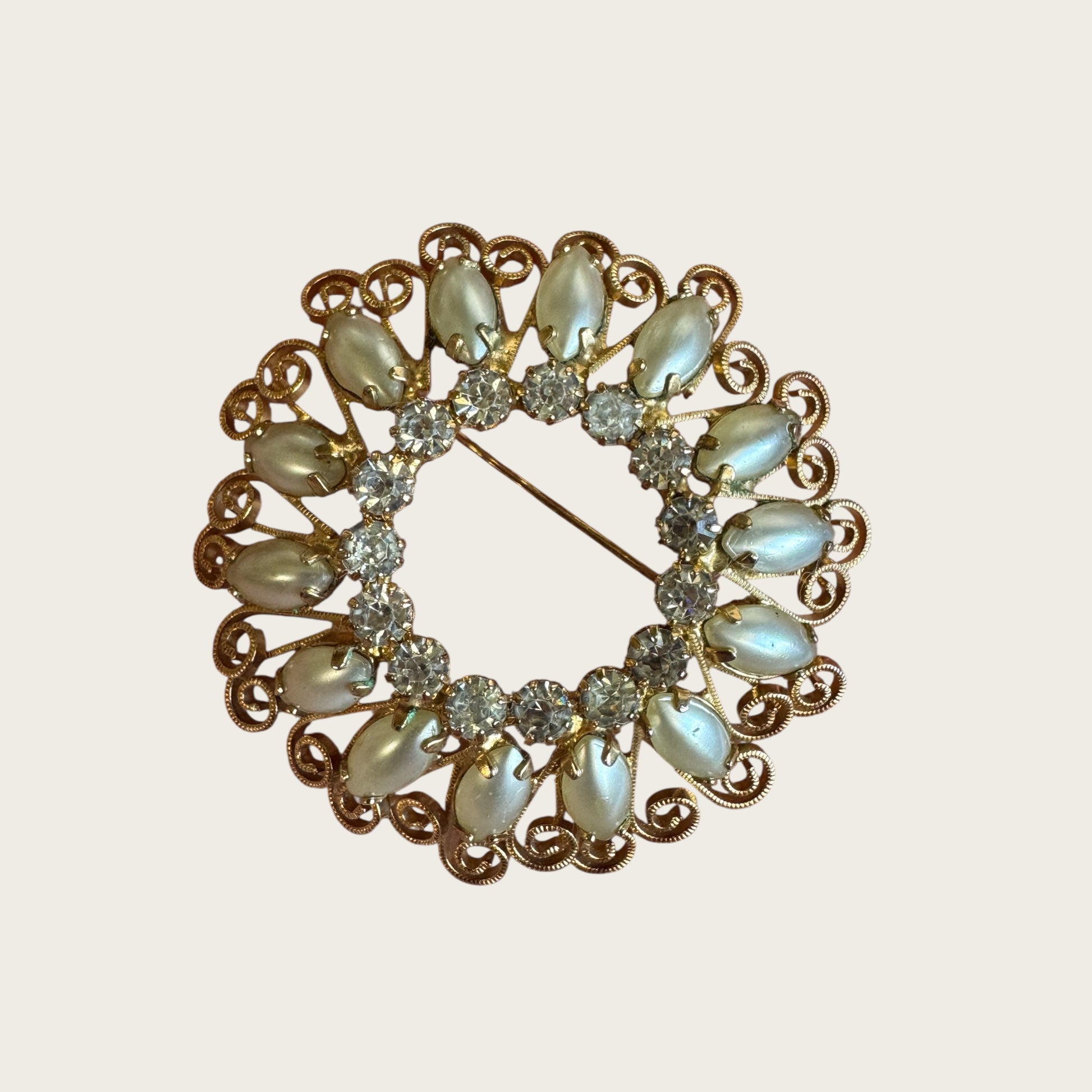 Vintage Hope Chest Faux Pearl & Rhinestone Demi-Parure – Brooch & Clip Earring Set – Mid-Century Gold-Tone Filigree Design