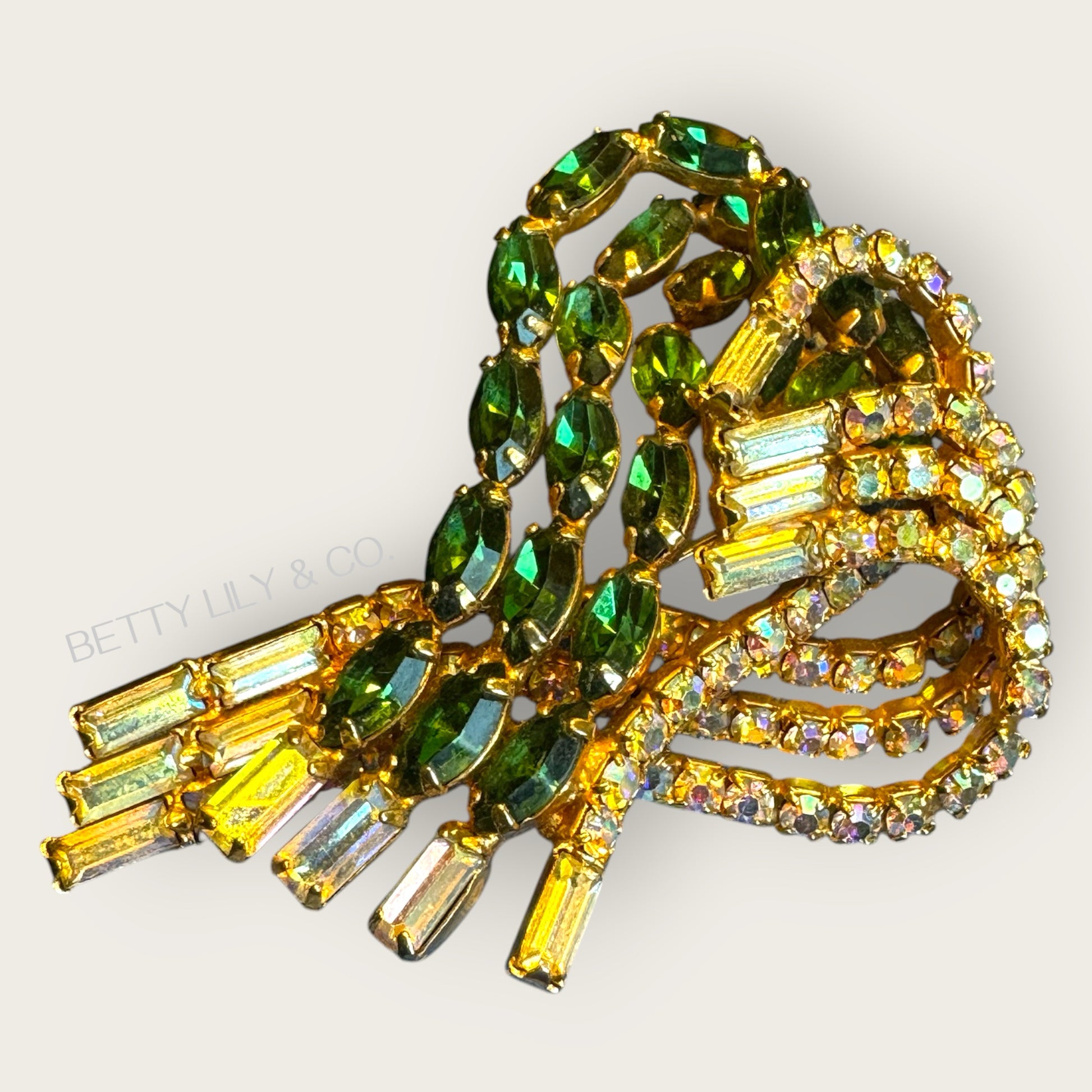 Mid-Century Emerald & Aurora Borealis Rhinestone Swirl Brooch – Unsigned Hobé Style