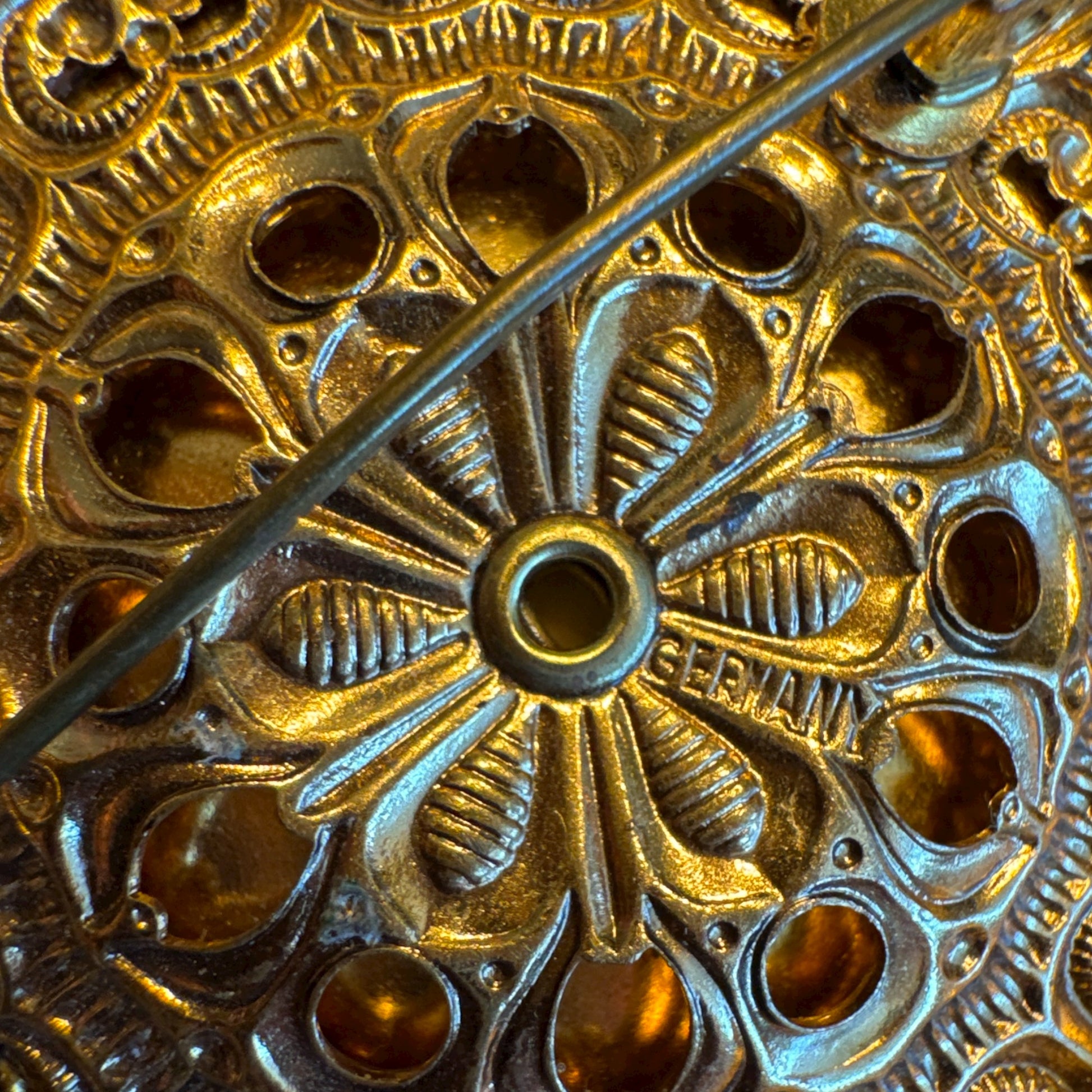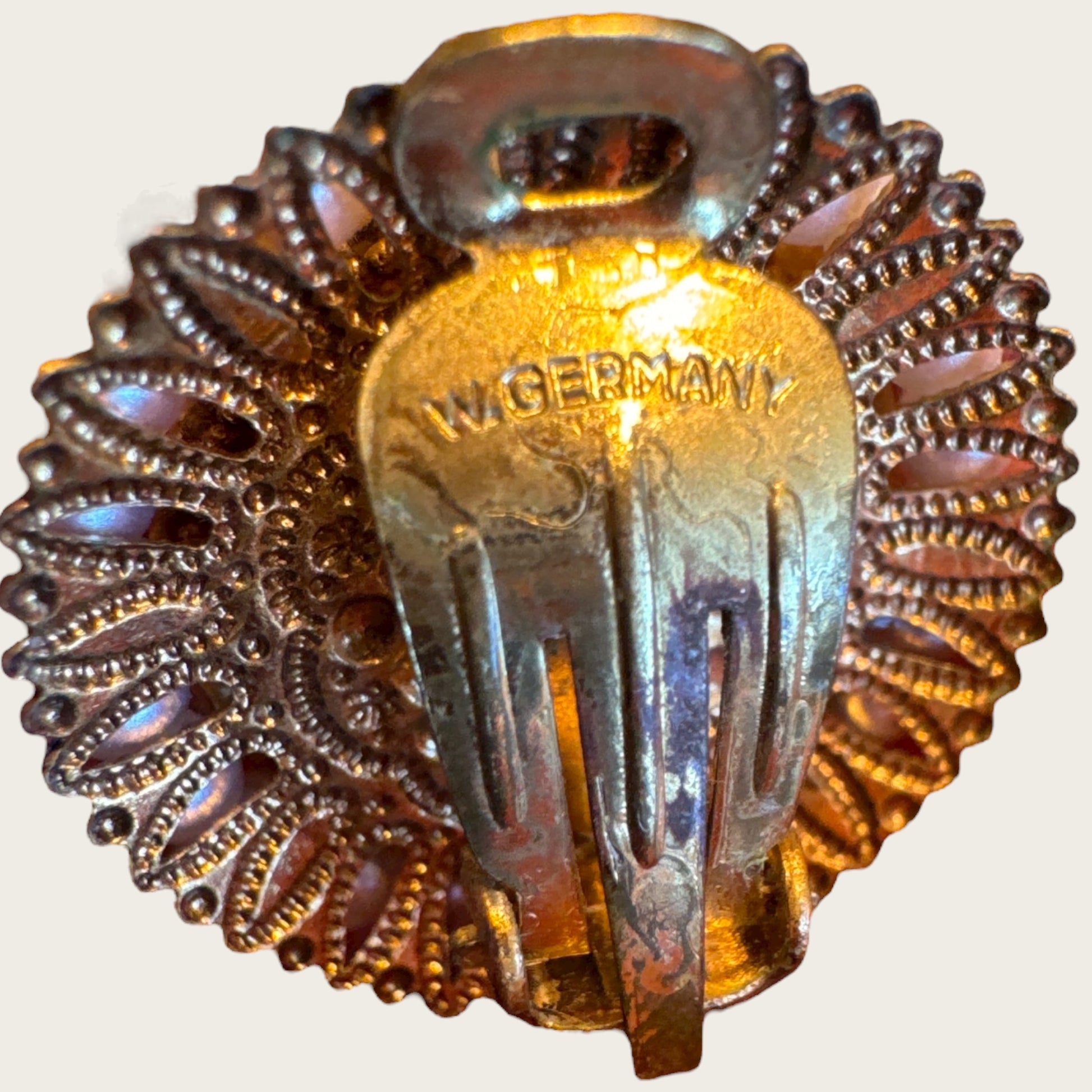 West Germany export jewelry holds a distinct place in mid-century costume history, known for its hand-finished components, regional floral transfers, and ornate metal mountings. Complete signed sets in this condition are increasingly scarce, making this a beautiful addition to a refined vintage floral or European costume jewelry collection.