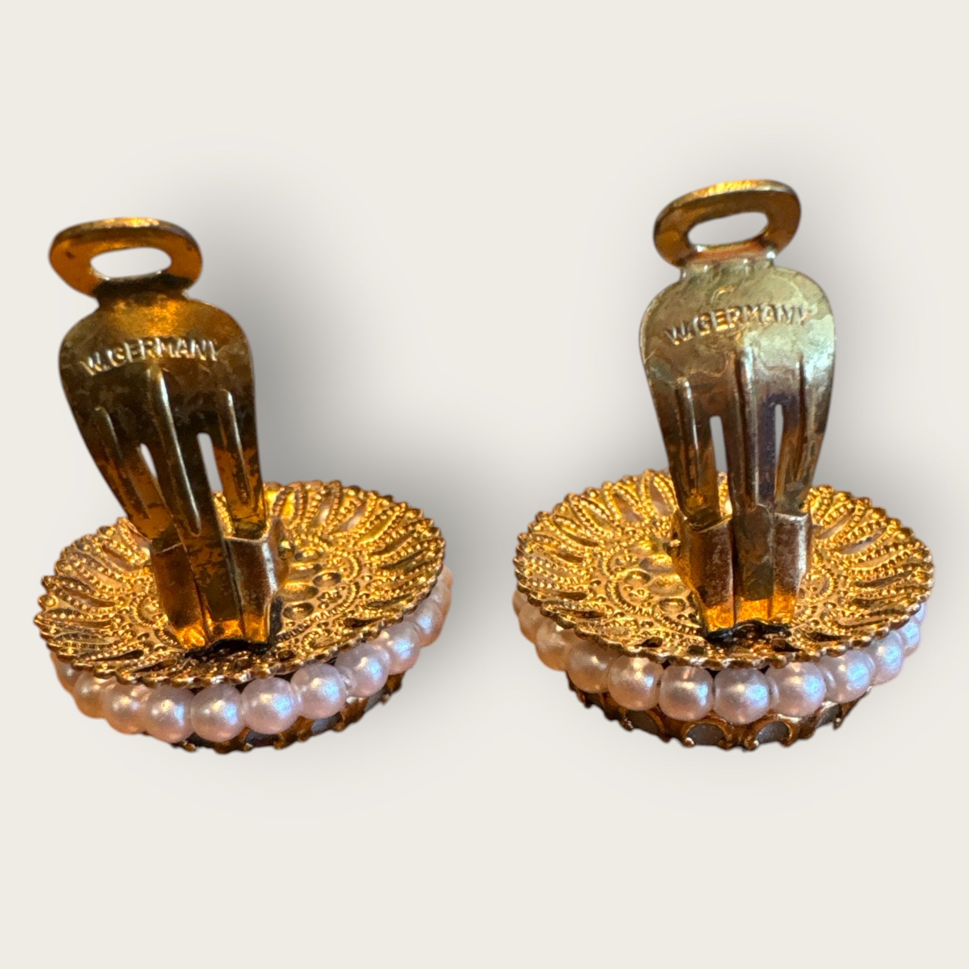 A beautifully preserved mid-century West Germany demi-parure featuring intricate porcelain transfer plaques framed in openwork gold-tone filigree and encircled by luminous faux pearls. Produced during the 1950s–1960s export era, this design reflects the romantic European aesthetic of the time: floral transfers applied by hand, set within ornate metalwork, and finished with soft yet radiant pearl halos.