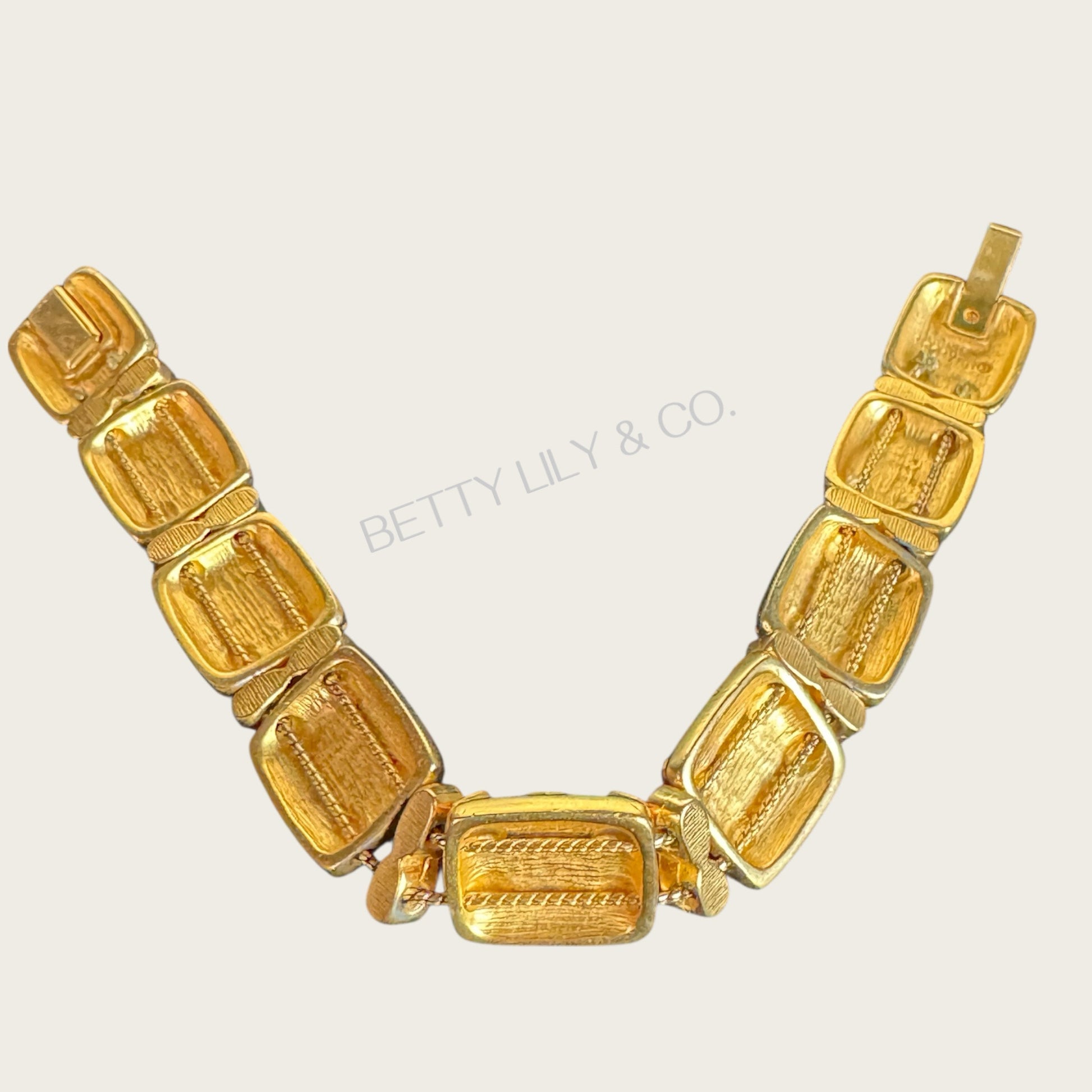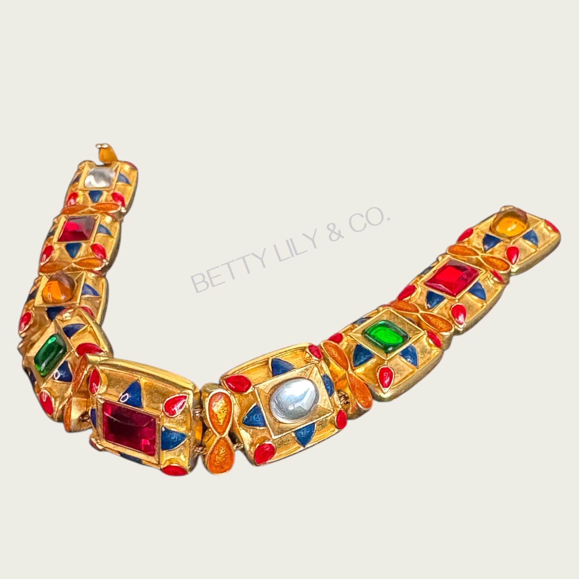 This signed MMA USA enamel and glass cabochon bracelet is a remarkable example of museum-quality craftsmanship and historical revival artistry. Each articulated panel is richly adorned with hand-painted enamel in a vibrant, multi-color palette—deep cobalt blue, ruby red, emerald green, amber, and pearl white—framed in a soft antique gold tone.