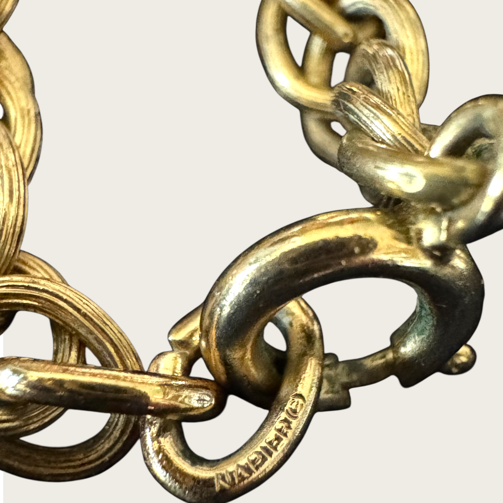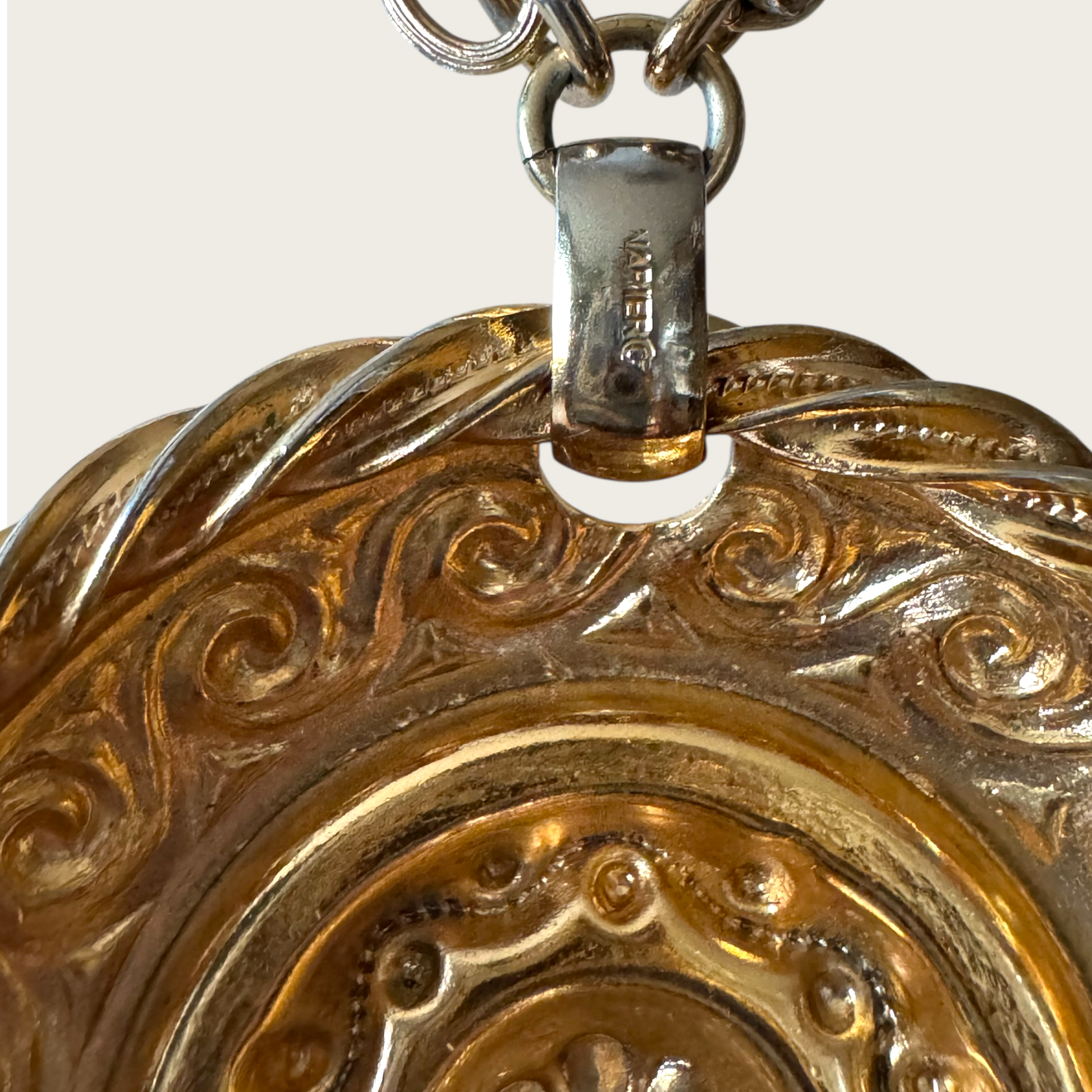 Napier, one of America’s most enduring jewelry houses, was known for transforming classical inspirations into wearable art. This Renaissance Revival–inspired medallion evokes the grandeur of ancient coins and architectural ornamentation, while maintaining the chic versatility that made Napier a household name. Whether styled as a solo statement or layered with other gold chains, this necklace embodies timeless vintage elegance.