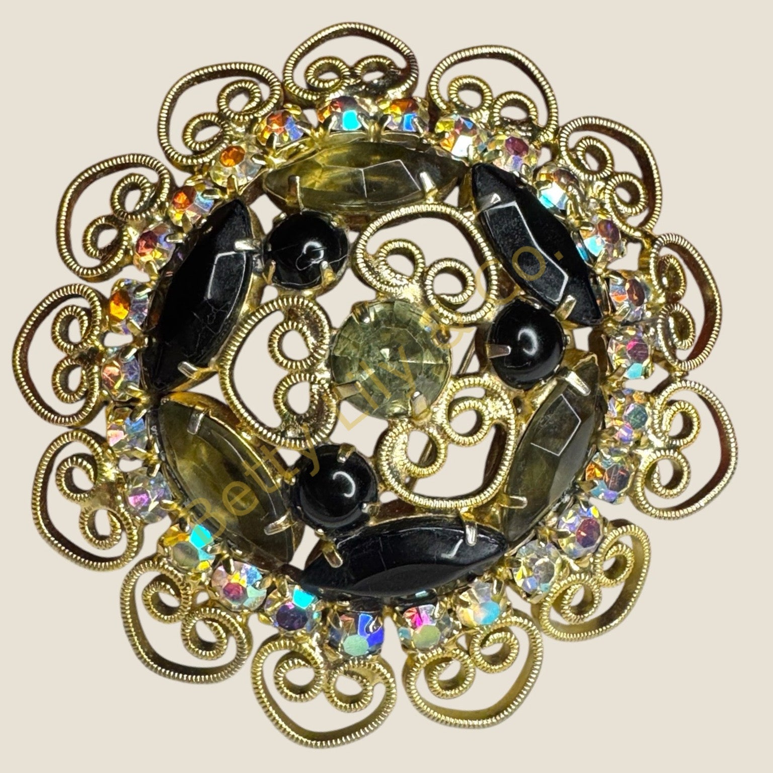 This striking mid-century brooch commands attention with a bold mix of deep black navette stones, smoky gray marquises, and glossy round black cabochons — all elevated by a halo of rainbow-flashing aurora borealis rhinestones. The gold-tone metalwork features ornate filigree scrolls that create a dimensional wreath form with a subtle dome silhouette.