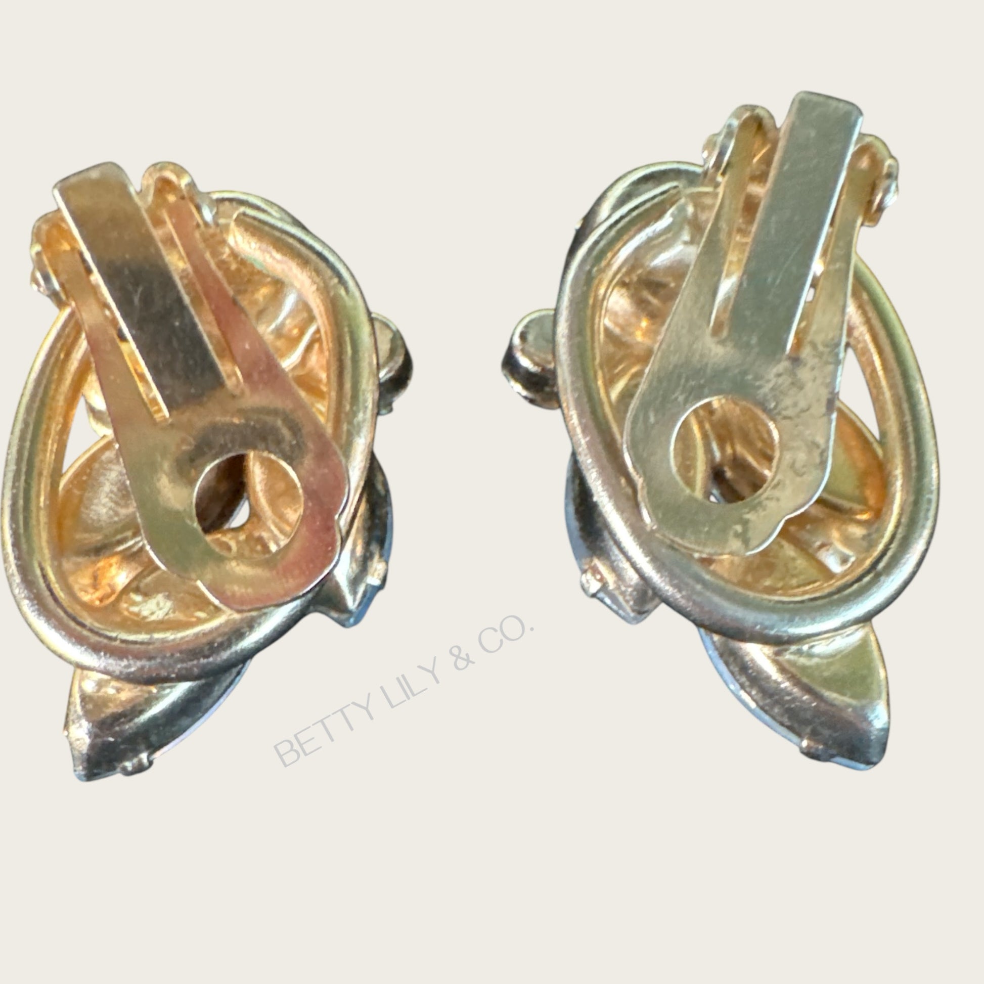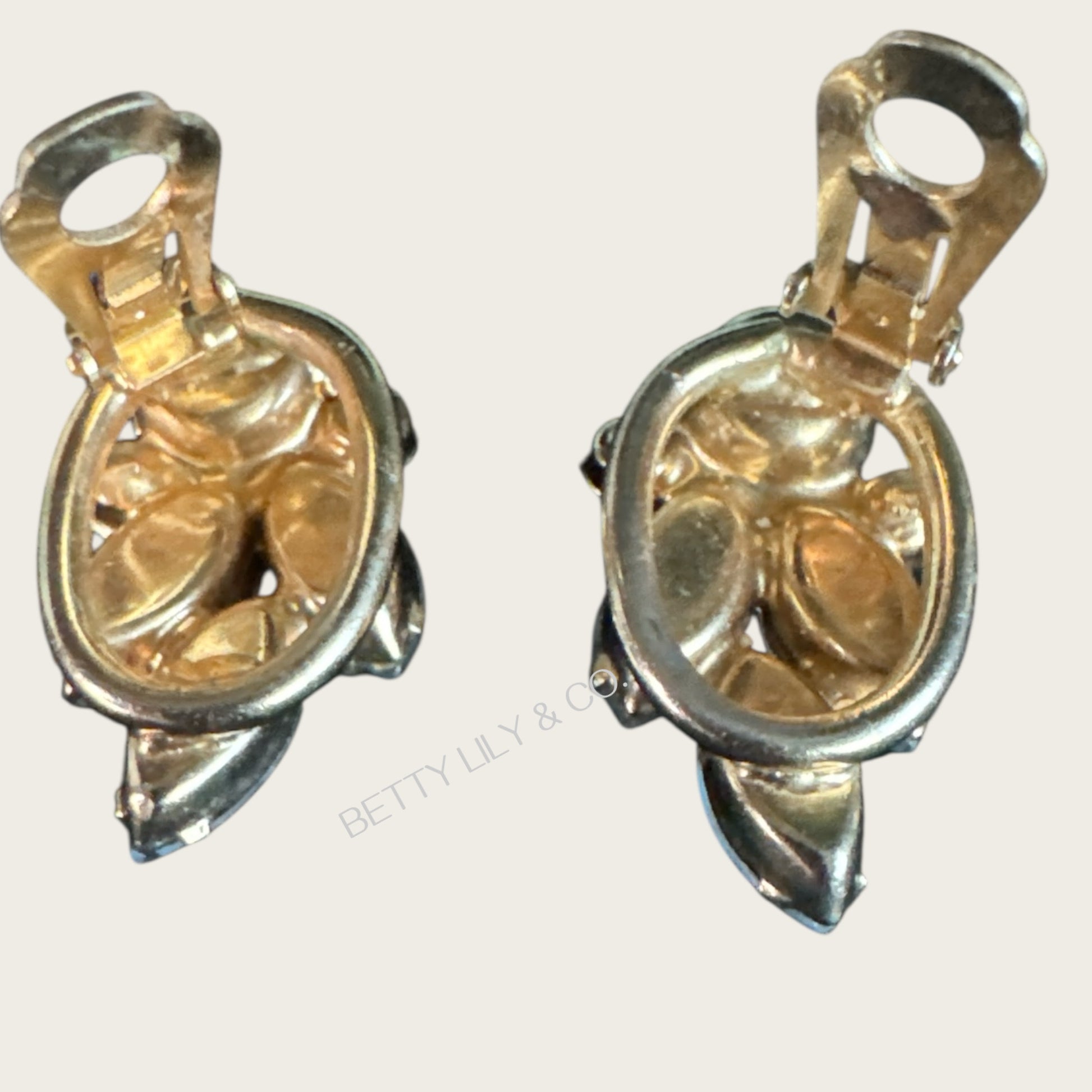 Earrings: Approximately 1½ inches tall × ⅞ inch wide, clip-on backs