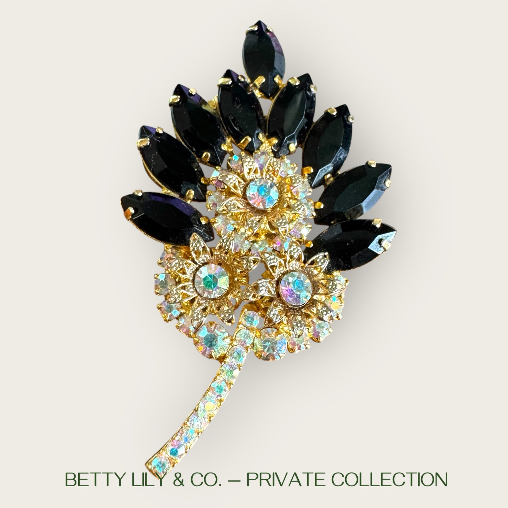 This exceptional mid-century brooch by DeLizza & Elster (Juliana) showcases dramatic black navette rhinestones arranged in a dimensional sculpted leaf. Three radiant floral clusters feature fiery aurora borealis chatons set within golden filigree petals — a stunning juxtaposition of darkness and light that catches every sparkle.
