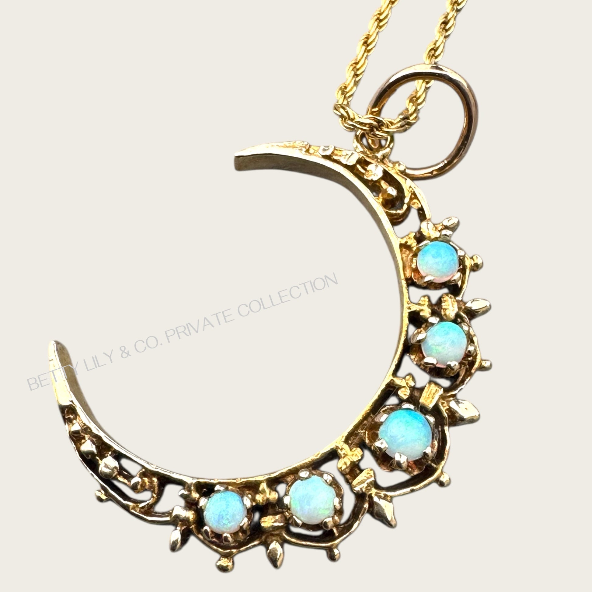 This is one of my treasured estate acquisitions from Aiden on Etsy — a breathtaking vintage 14K yellow gold crescent moon adorned with luminous natural opals. The workmanship is exquisite: sculpted gold, star-like prong settings, and glowing milky opals aligned along the curve of the crescent.