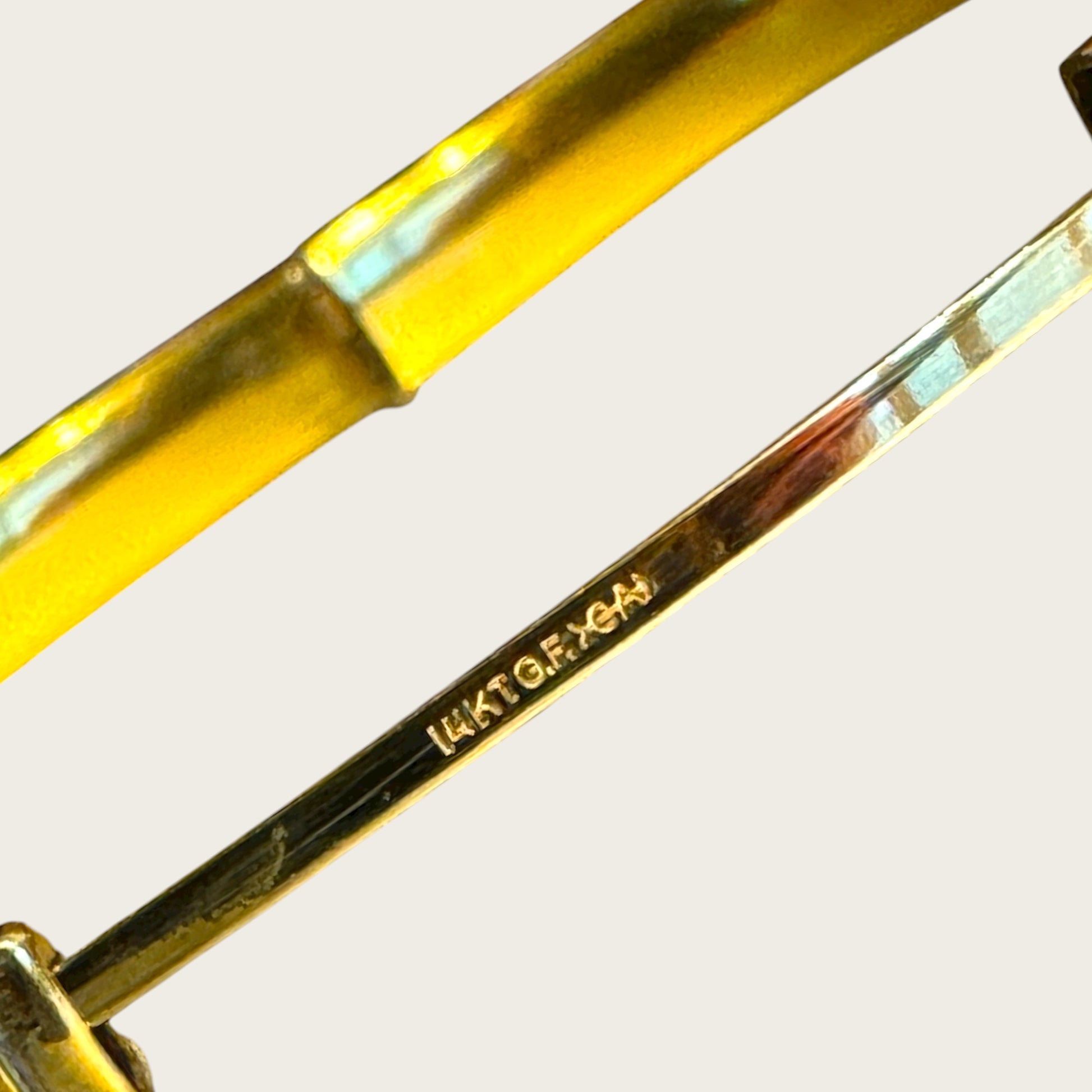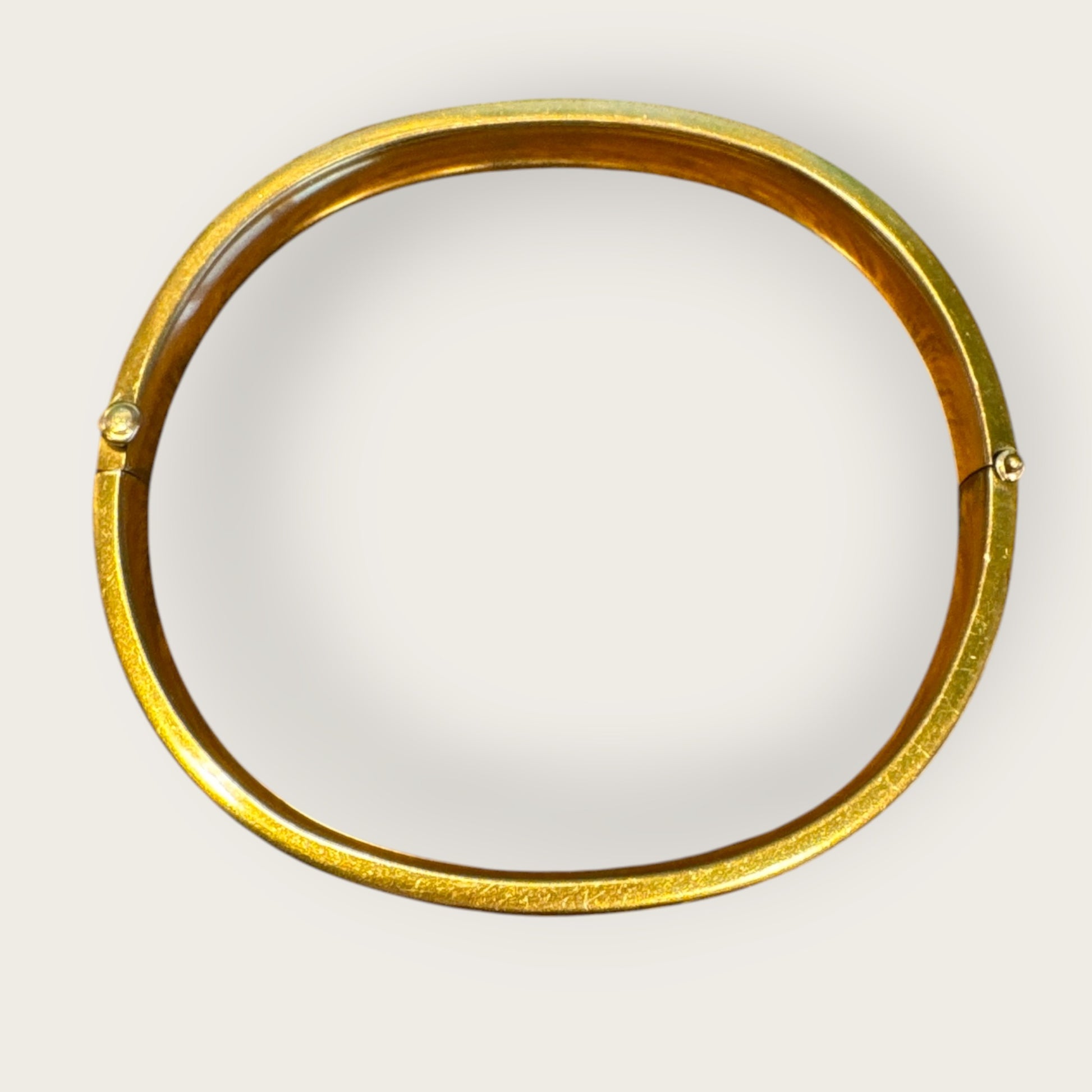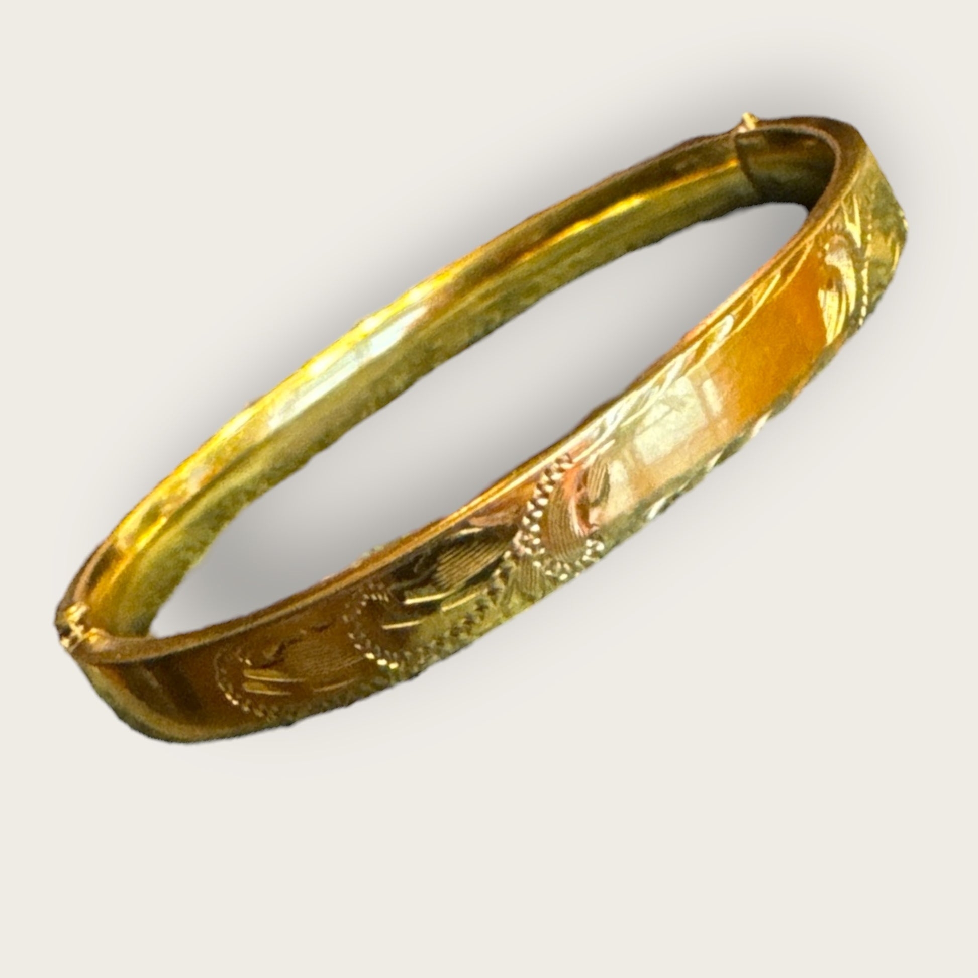 Well-preserved engraved gold-filled bangles of this era are increasingly scarce, especially with intact hinge mechanisms and clean interior walls. This piece offers the appearance and presence of solid gold without the modern fine-jewelry price point, making it an ideal everyday luxury piece for collectors who appreciate true vintage craftsmanship.