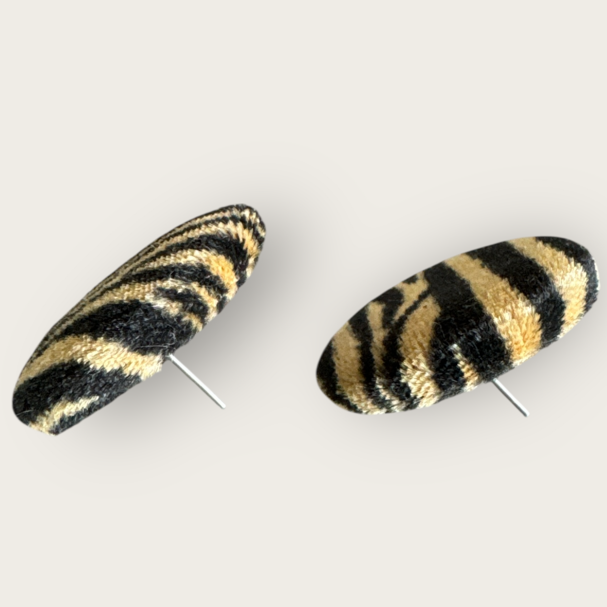 Channel the bold energy of the 1990s with these zebra print fabric earrings. Covered in soft fabric with a striking black-and-cream stripe motif, these rounded studs make a fearless yet wearable statement. Measuring 1 ¼ inches in diameter, they’re lightweight, comfortable, and the perfect size to draw attention without being overpowering.