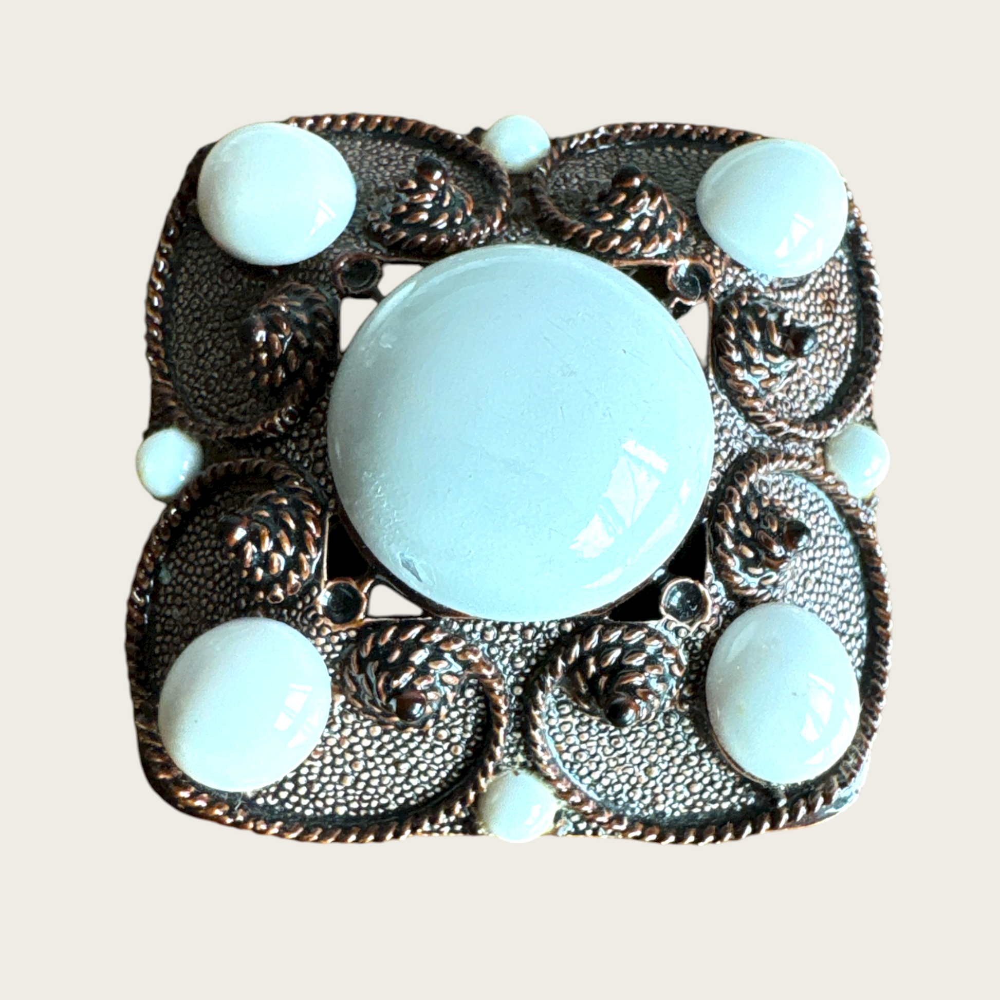 A striking vintage brooch signed Capri, crafted with layered detail and glowing white glass cabochons set in an ornate, textured metal frame. This piece captures the bold yet elegant style of mid-century costume jewelry, offering a versatile accessory that pairs beautifully with both casual and formal looks.