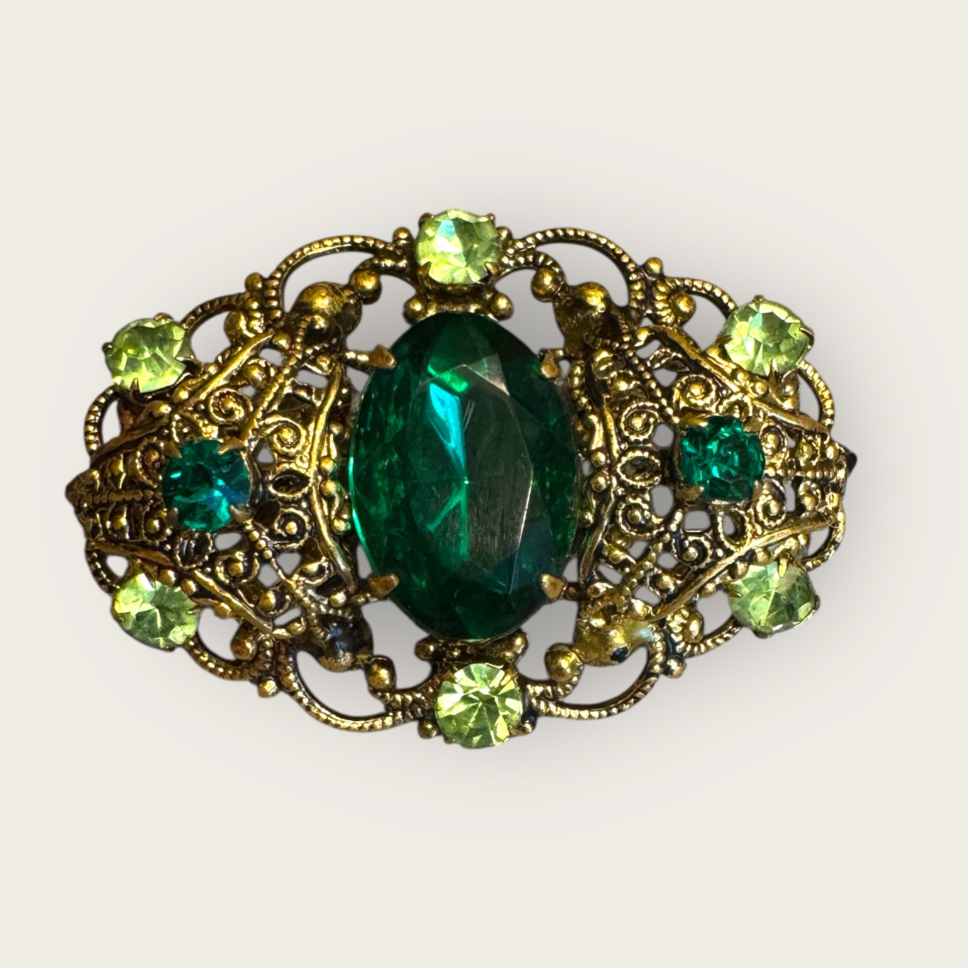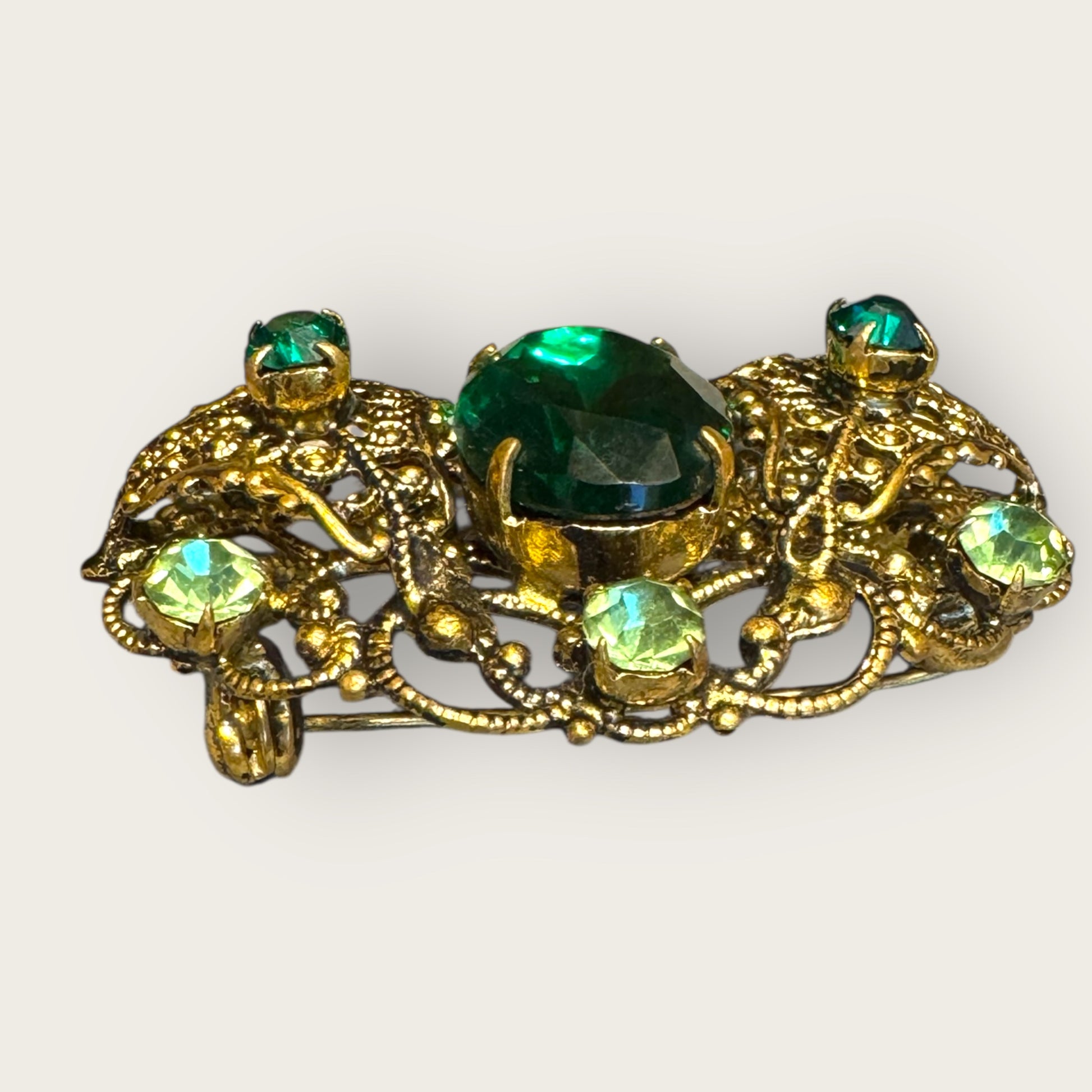 Vintage Emerald & Peridot Rhinestone Filigree Brooch – Antique Gold Setting