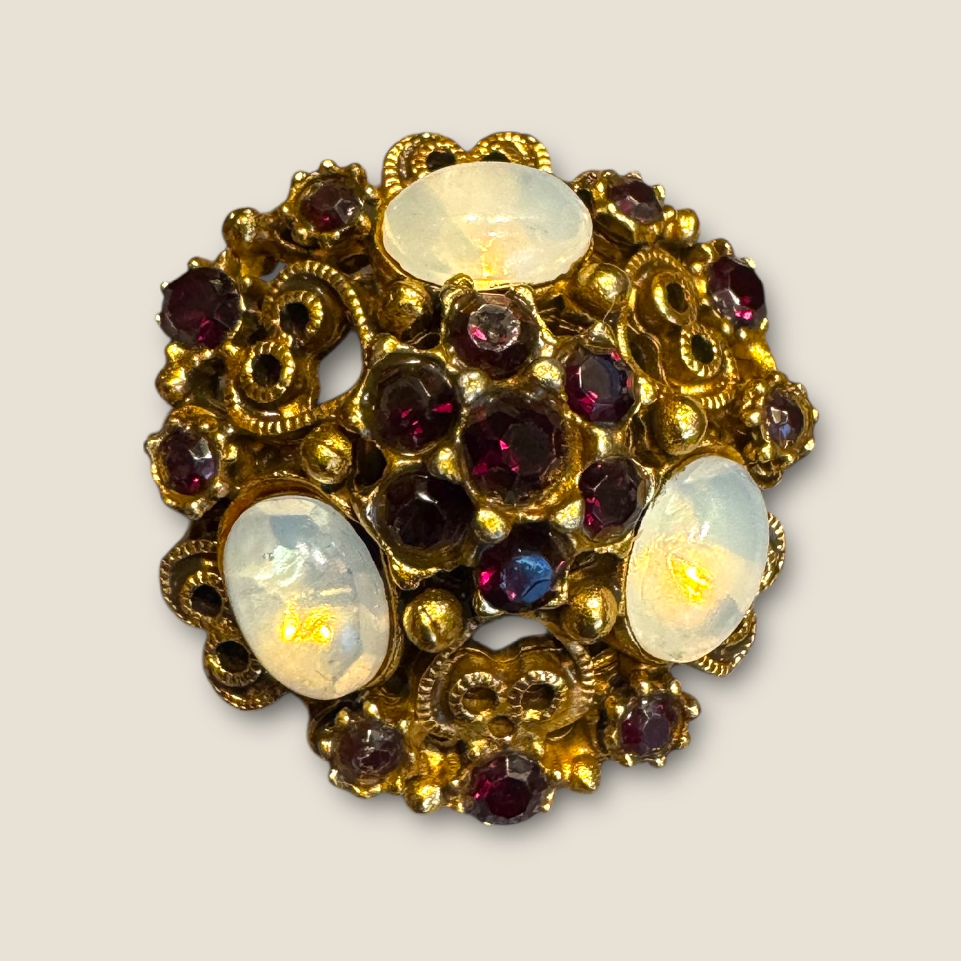Vintage Florenza Domed Filigree Brooch – Antique Gold with Garnet Rhinestones & Moonstone Cabochons