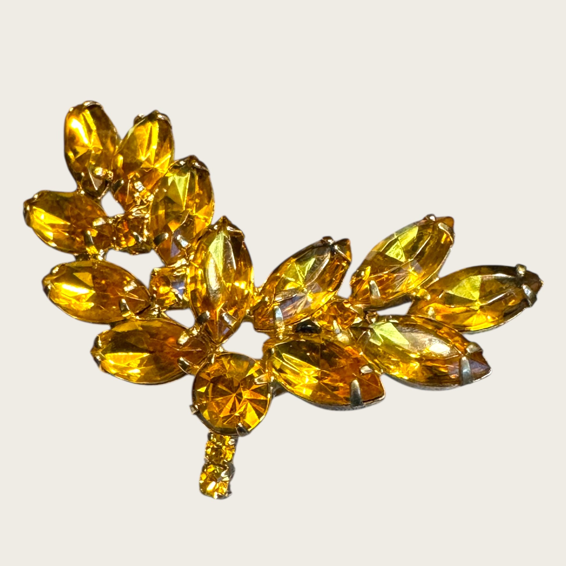 This brooch is a timeless mid-century gemstone-style spray — warm, fiery, and full of movement. The golden topaz palette makes it an ideal piece for fall styling, earth-toned outfits, or collectors who adore deep golden hues with vintage sparkle. A showstopping accessory with classic elegance.