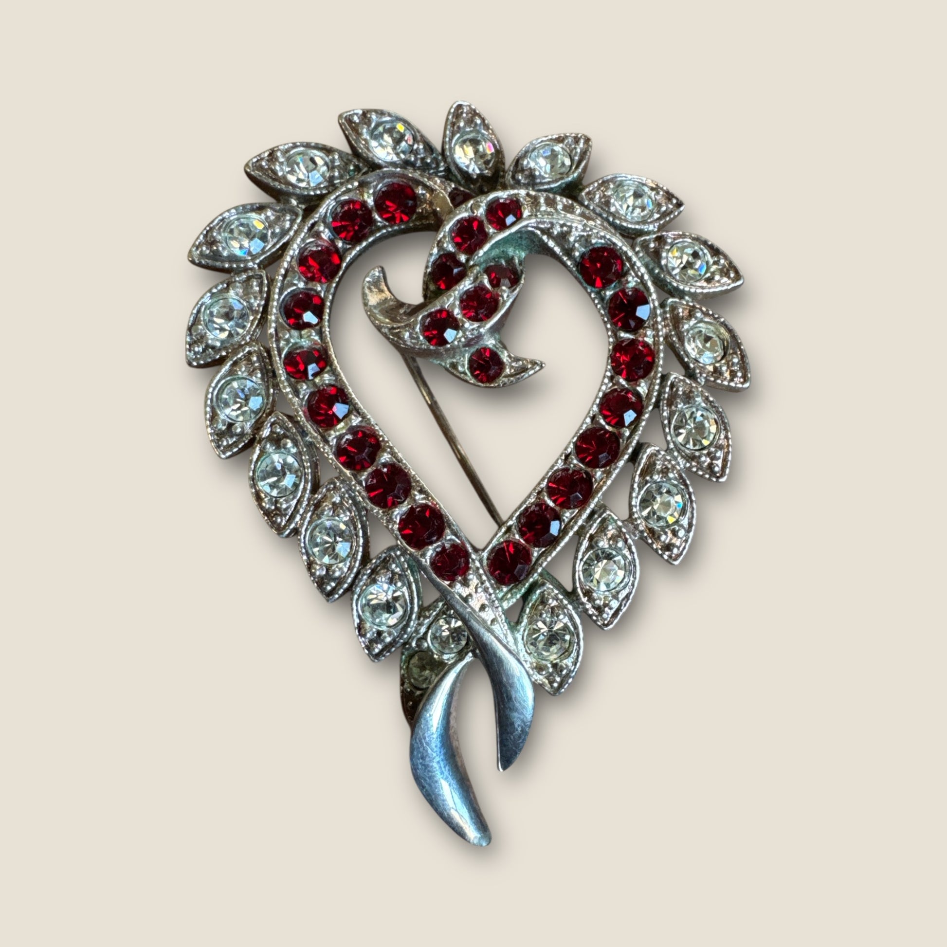 Radiant, romantic, and unmistakably mid-century, this vintage heart-shaped brooch pendant captures the allure of classic Alfred Philippe–era Trifari design. Sculpted in silver-tone metal, the openwork frame is adorned with brilliant ruby red rhinestones and clear diamanté accents, forming a graceful, dimensional heart motif.