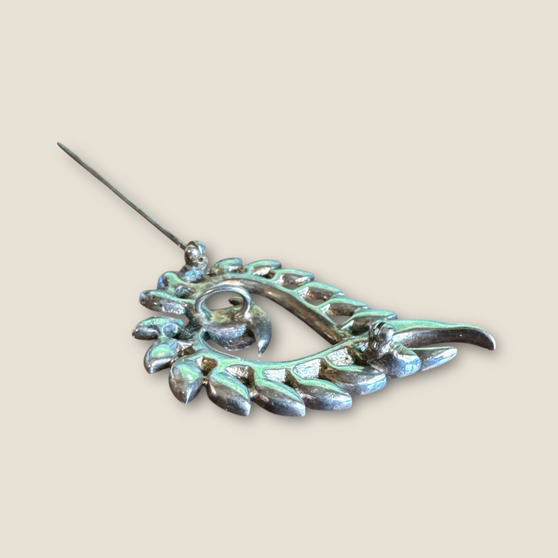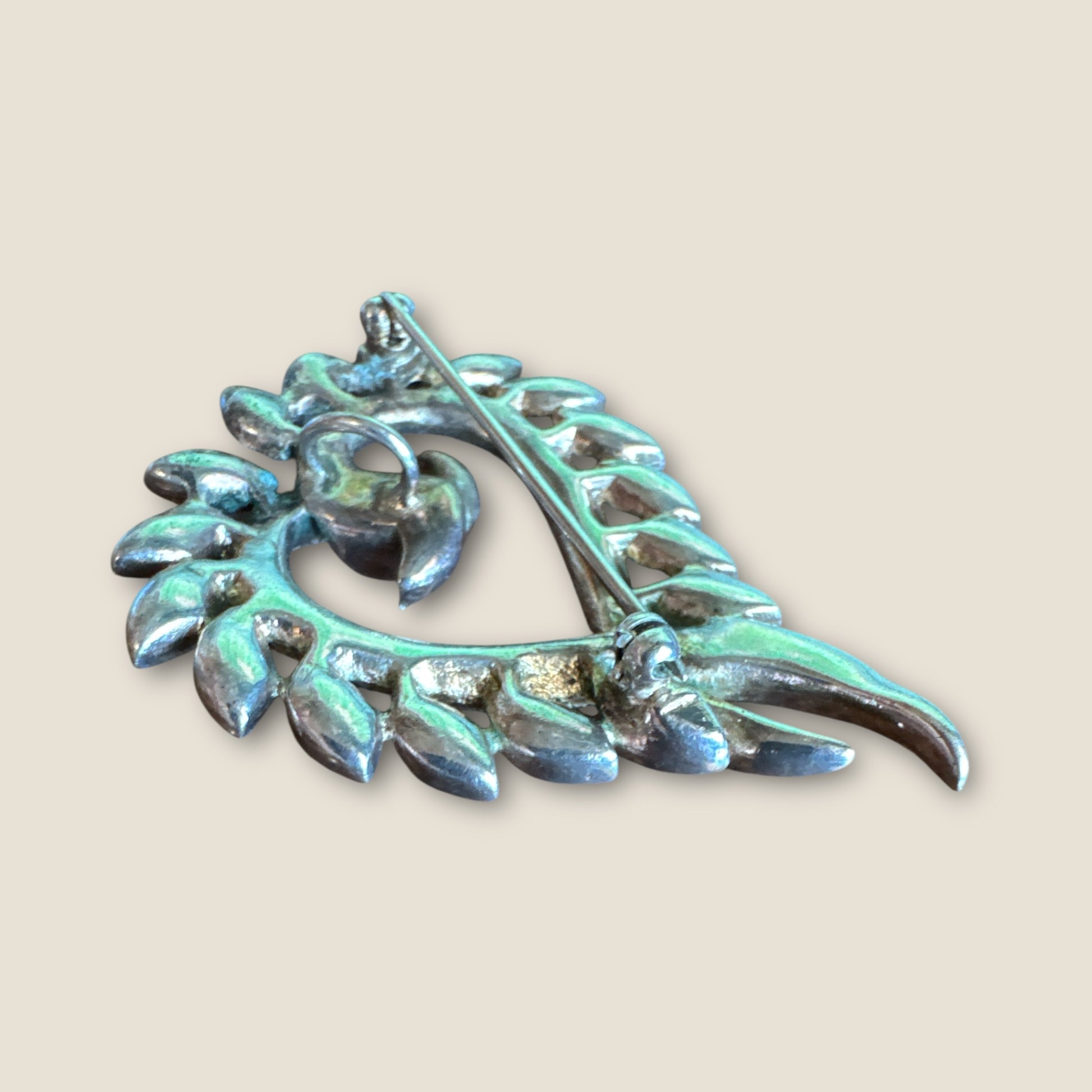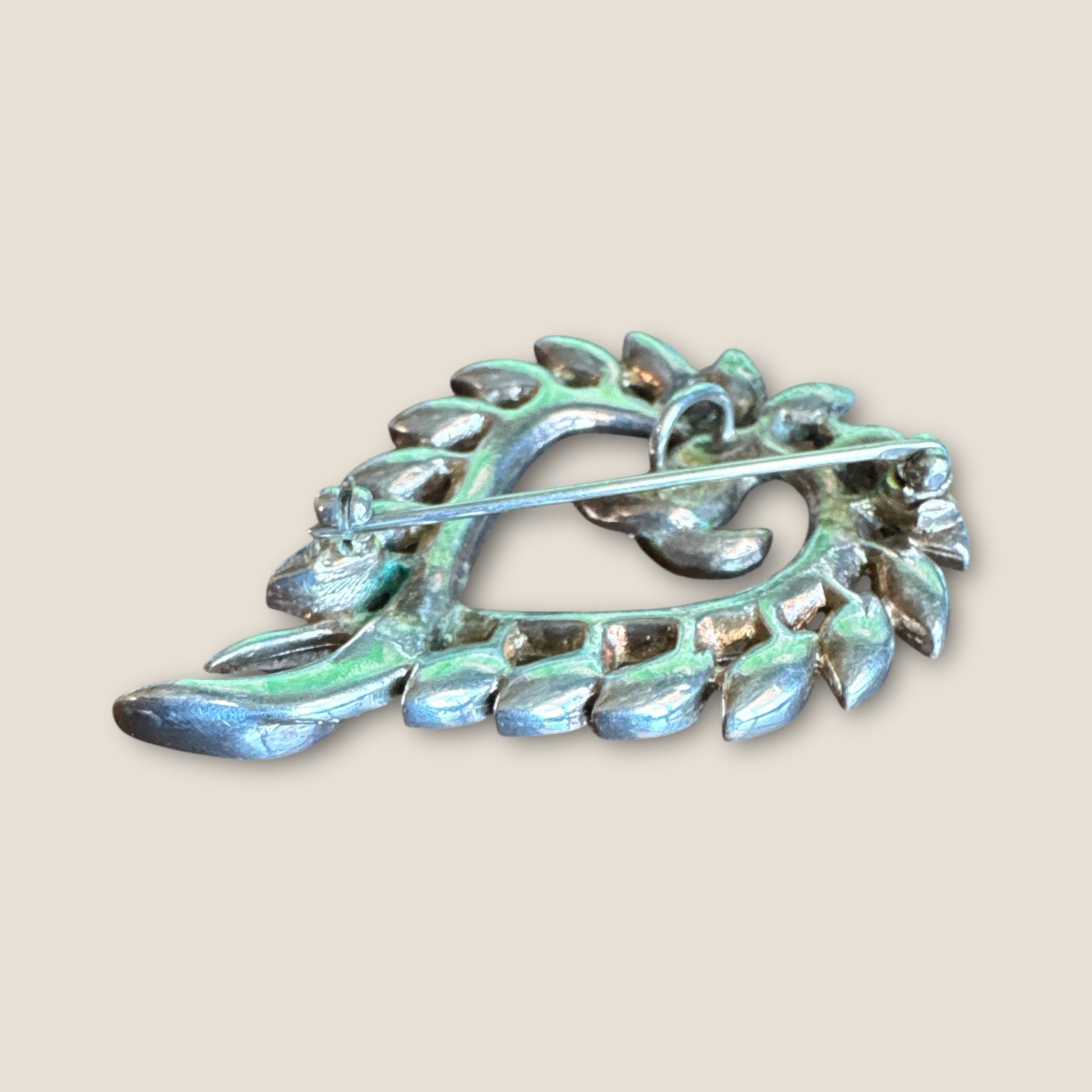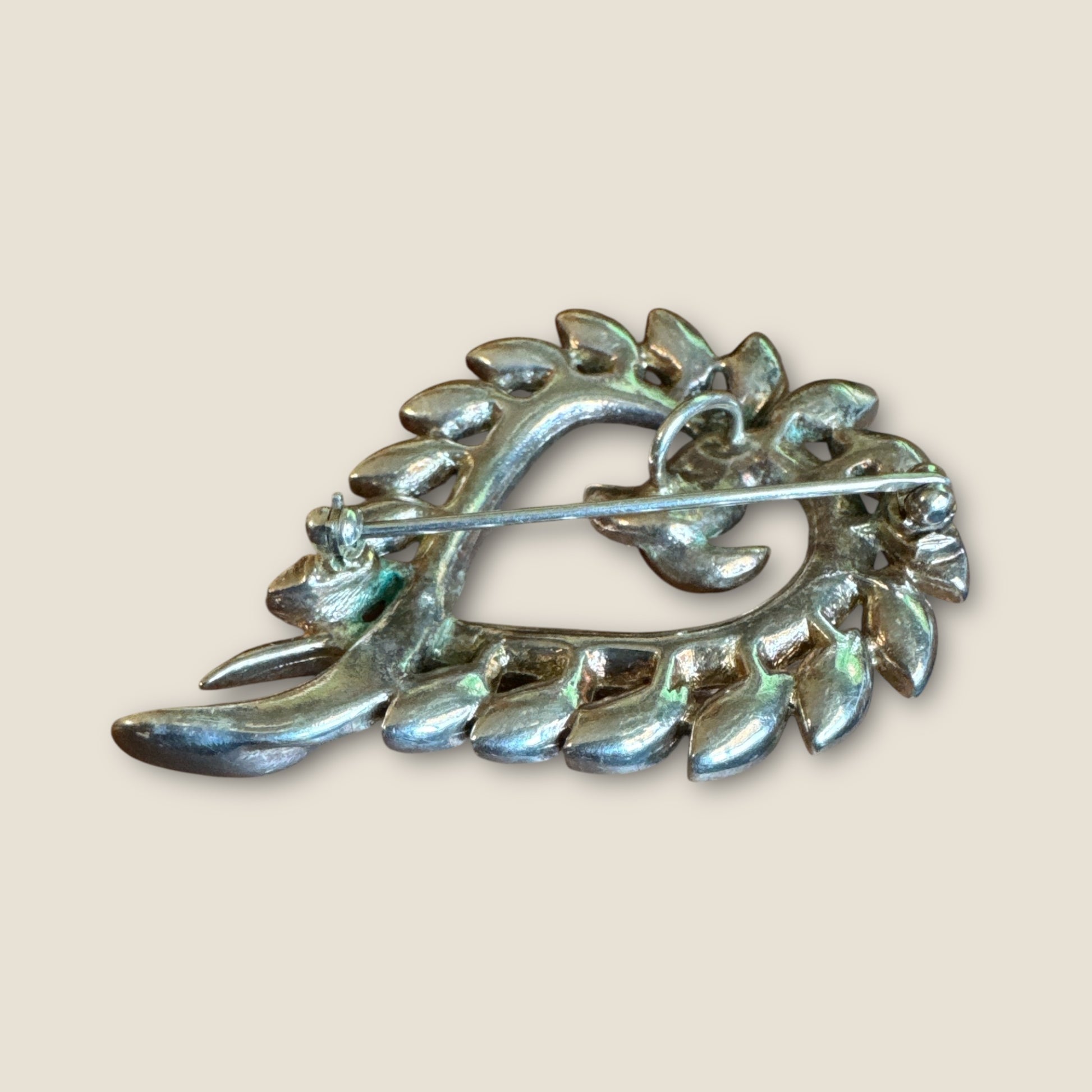 The leafy border and marquise-cut detailing add depth and sophistication, while the hidden bail on the reverse allows this piece to be worn as both a pendant and brooch. Its fiery red-and-clear contrast evokes the glamour of the 1950s, a time when jewelry design celebrated romance and refinement in equal measure.