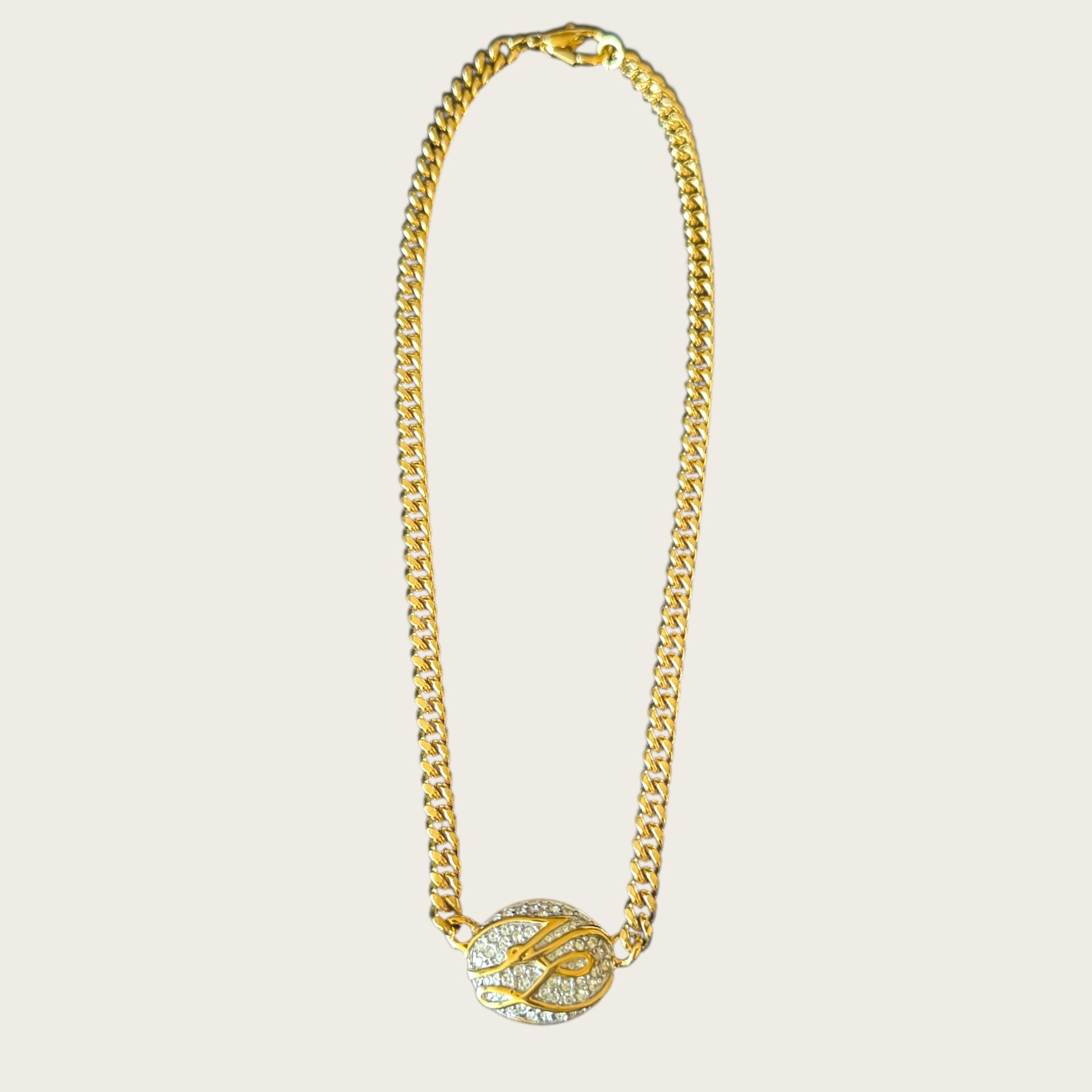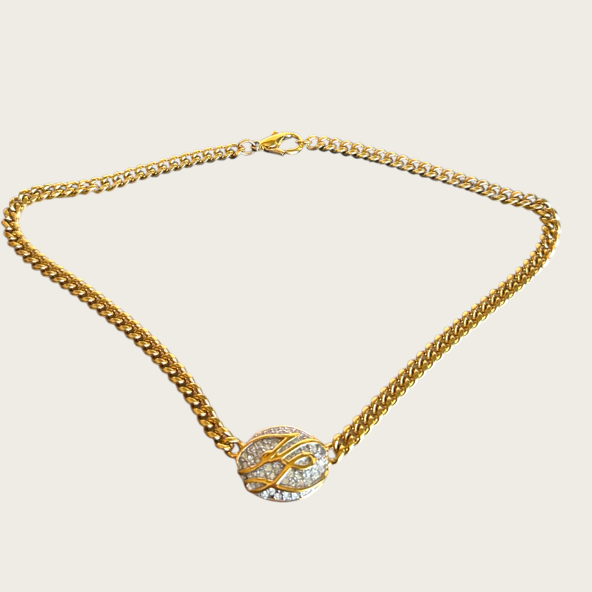 Karl Lagerfeld Couture Medallion Necklace – Signed Gold-Tone Curb Chain with Pavé Rhinestones, 1980s