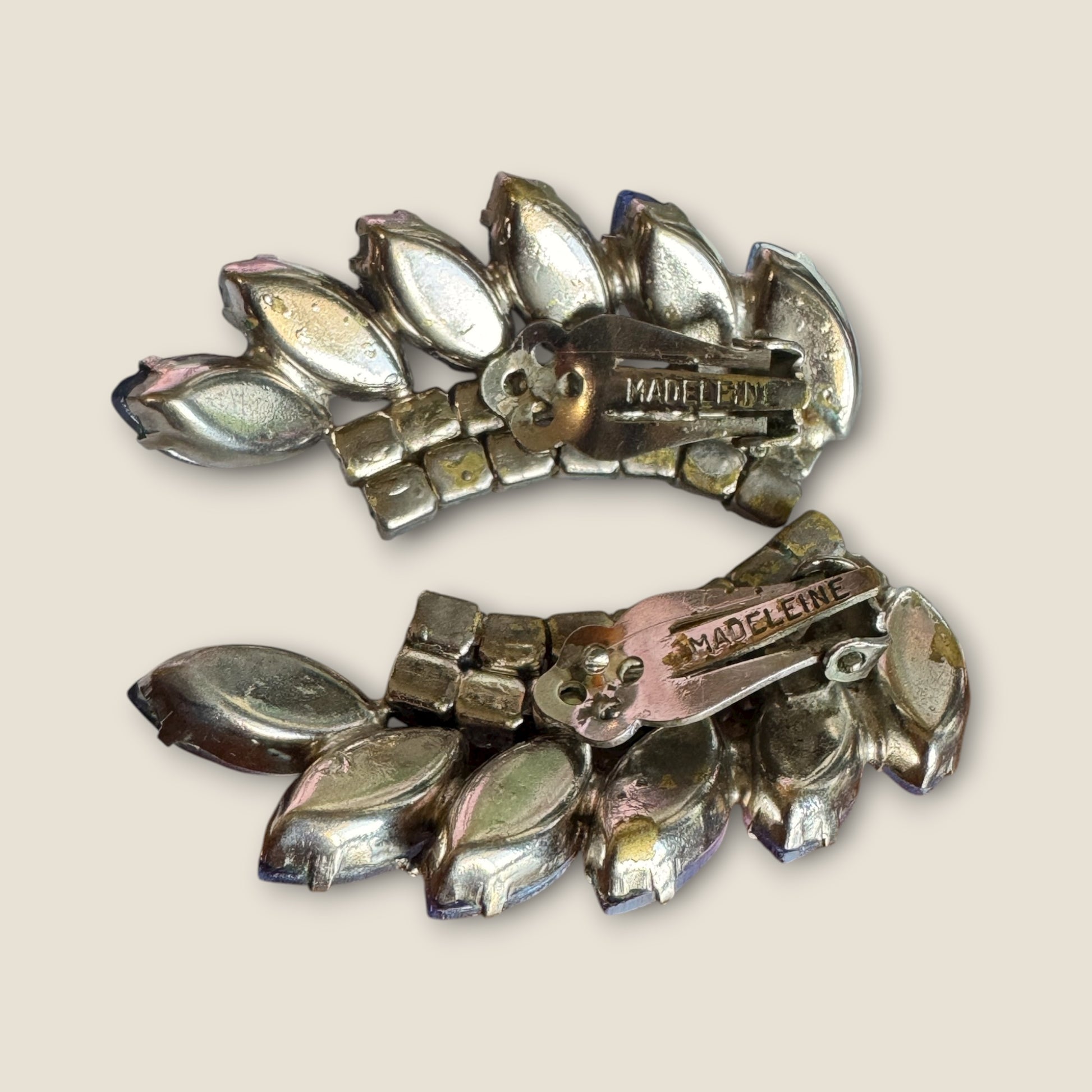 These earrings measure approximately 2 inches tall by 1 inch wide, making them a bold accessory that elegantly frames the ear. The stones remain bright and eye-catching, with their ombré glow reminiscent of the aurora borealis finishes popular in vintage costume jewelry.