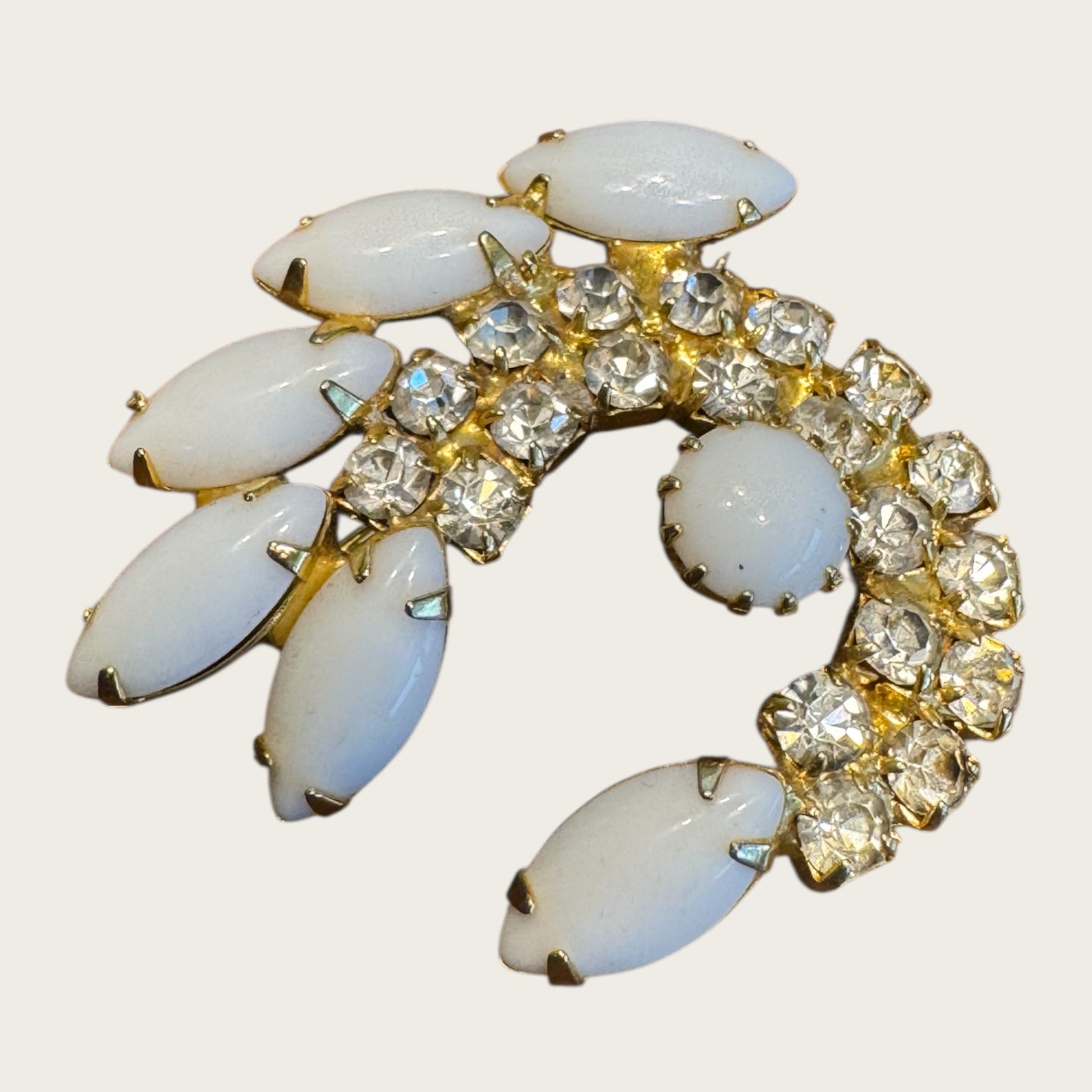 Milk glass jewelry has become increasingly sought-after for its clean silhouette and timeless sophistication — especially pieces with strong gold-tone and brilliant crystal contrast. This crescent formation is unique, sculptural, and incredibly flattering when worn. A distinctive addition to any curated vintage collection.