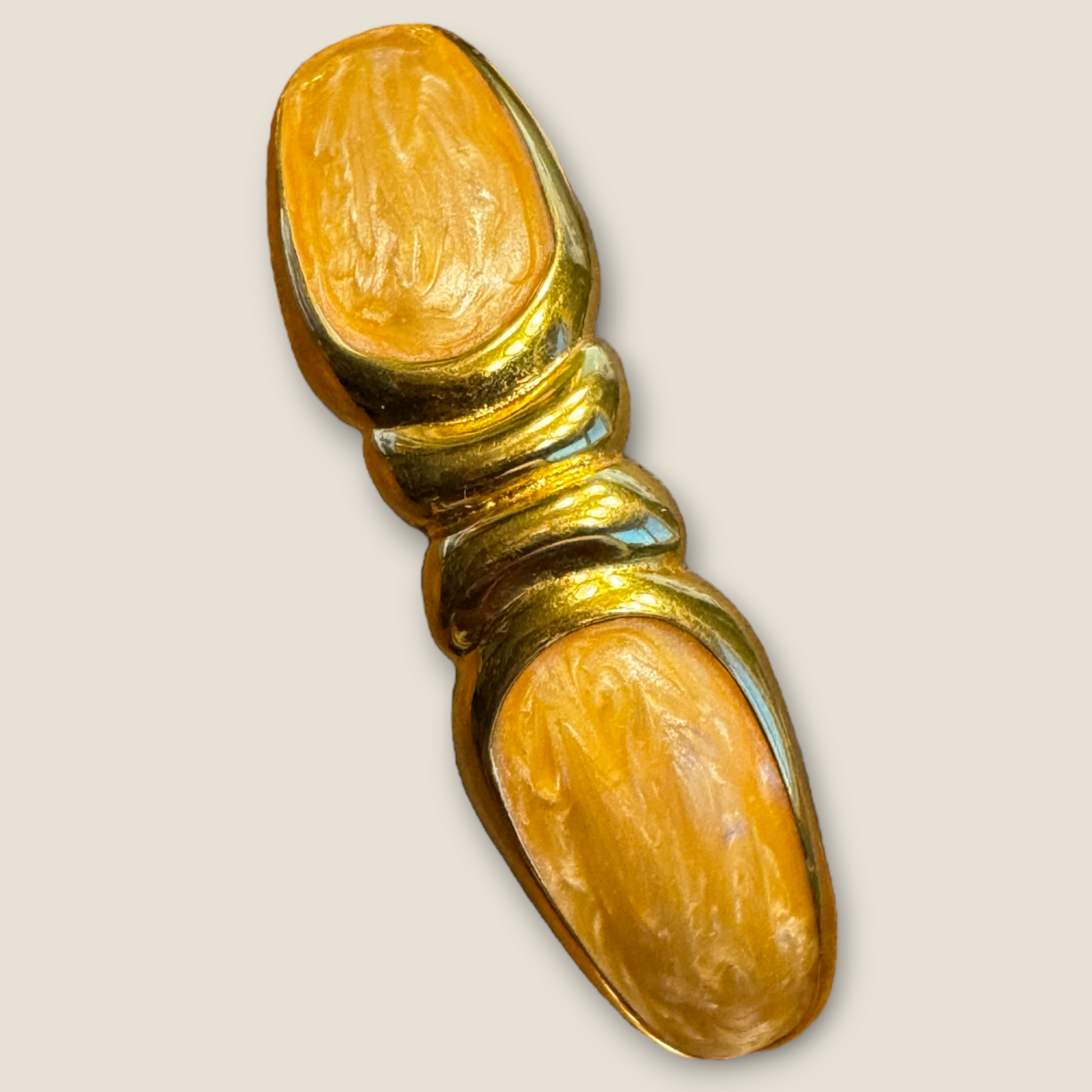 Polished gold-tone finish with glossy beige marbled enamel panels