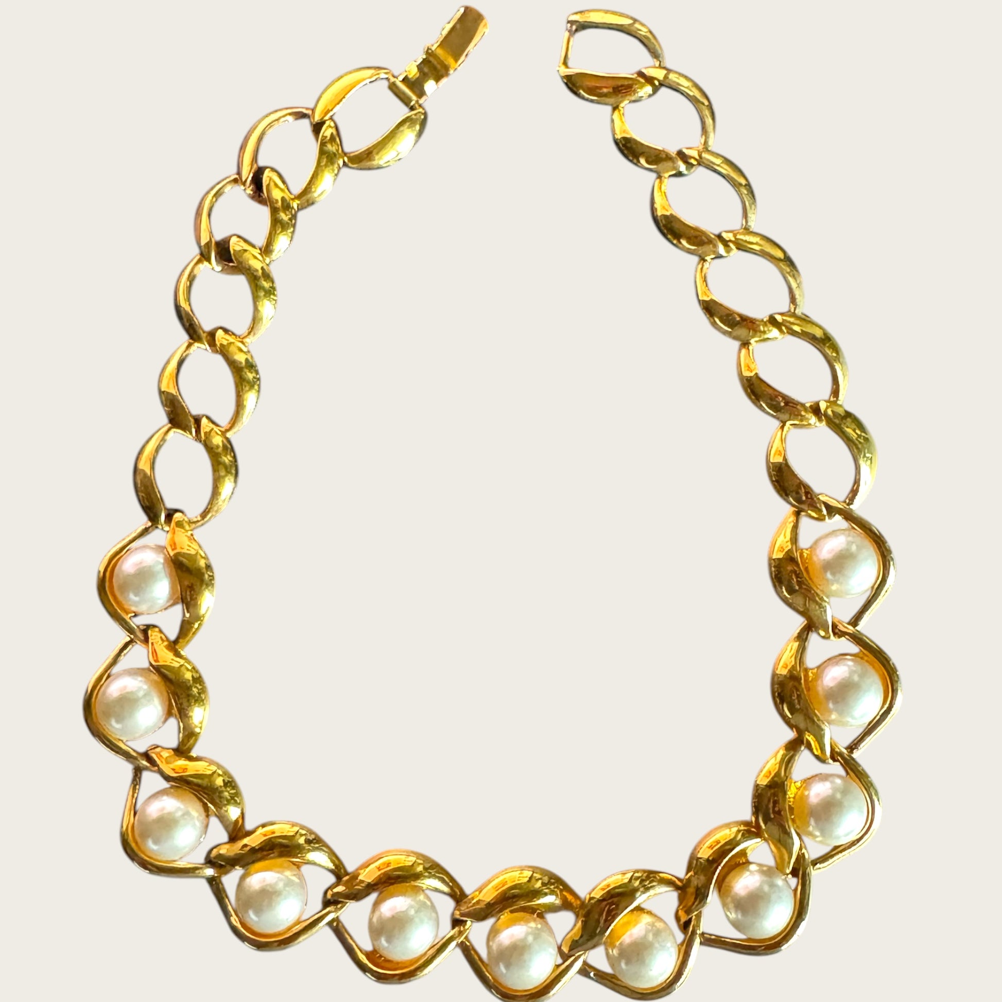 Condition: Excellent vintage condition. Pearls are glossy and intact with no coating loss. Very minimal gold wear to the final link nearest the clasp, not visible when worn and does not affect presentation.