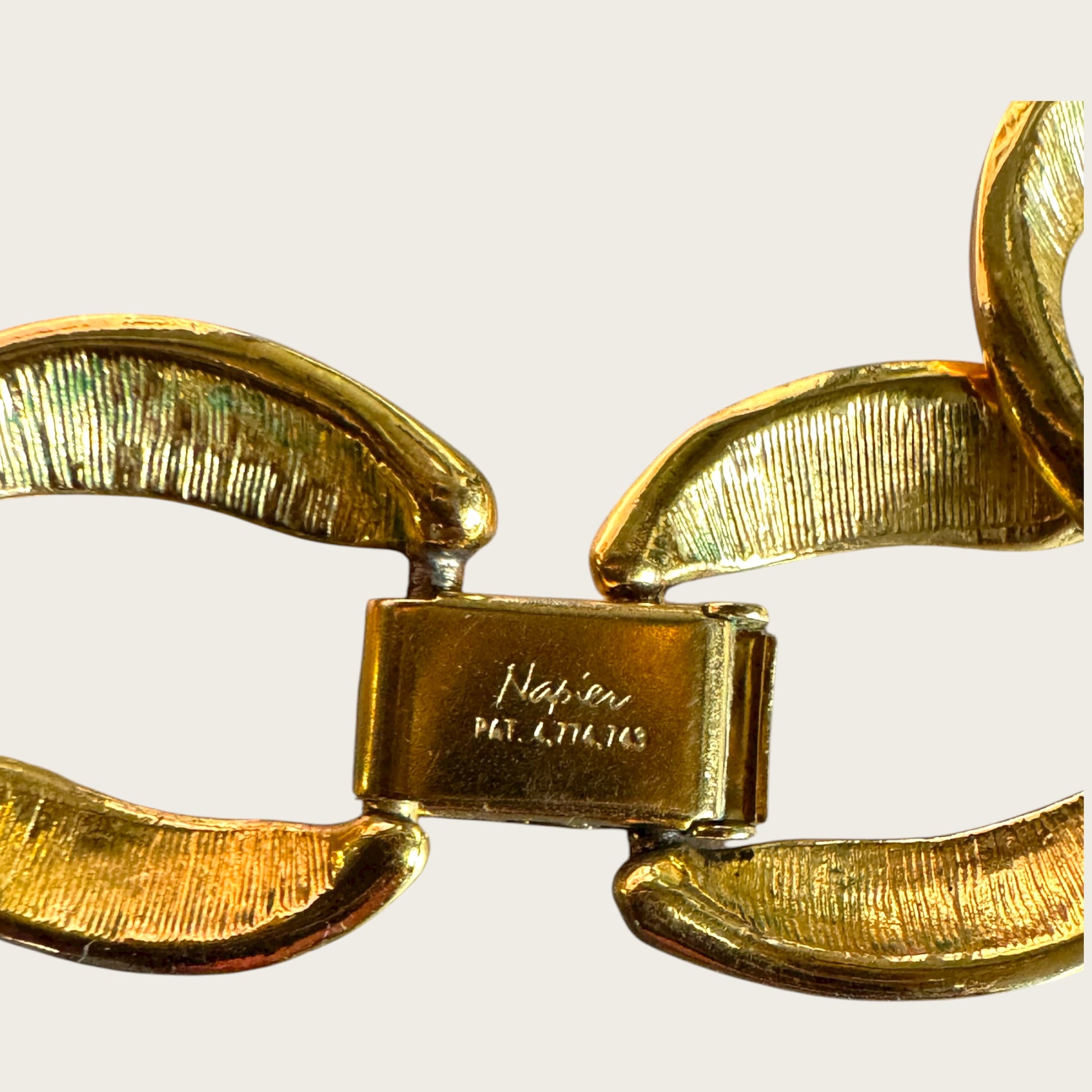 Napier pieces stamped with registered patent numbers — especially those featuring oversized pearls and sculptural links — represent the company’s peak design years before manufacturing moved offshore in the 1990s. Patent 4,774,743 specifically documents this exact clasp and link construction, making this necklace fully verifiable, historically anchored, and highly collectible.