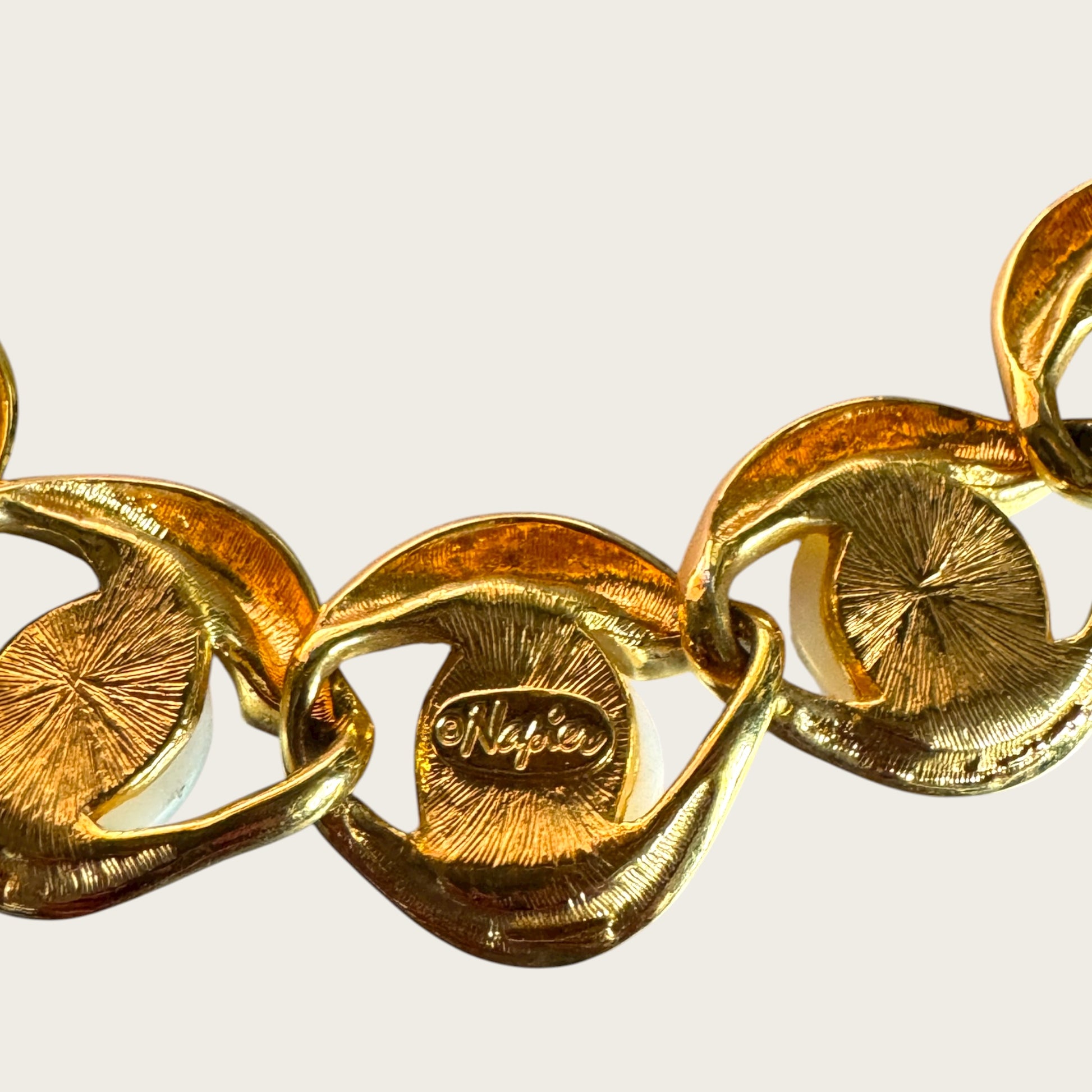 Each pearl is set into a curled, ribbon-like link with convex shaping and textured backs, creating an elegant drape and a luxurious weight. The necklace closes with Napier’s patented fold-over clasp, also marked. A timeless statement for collectors of vintage designer jewelry, lovers of bold 80s fashion, and anyone who appreciates substantial, well-made costume jewelry.