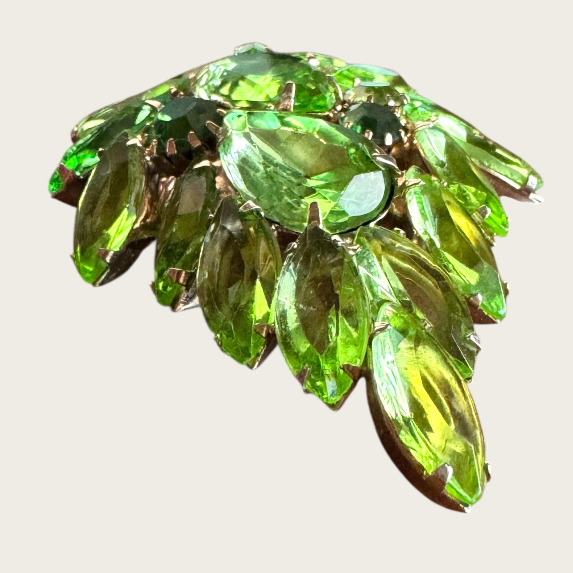 A luminous mid-century brooch crafted with layered peridot and emerald green rhinestones in a cascading leaf motif. The design features two large pear-shaped center stones surrounded by navette-cut rhinestones, accented by deep green rounds and a single glowing uranium glass chaton at the center. The result is a vibrant and elegant piece that reflects light beautifully from every angle.