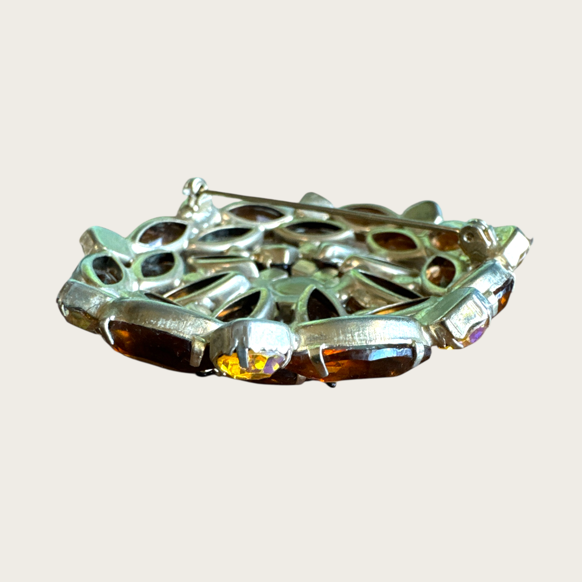 This exquisite vintage brooch captures the warmth and opulence of mid-century glamour. Designed in a classic round form, it features rich root beer–colored marquise rhinestones encircling a radiant center of aurora borealis crystals that shimmer with hints of topaz and gold. The domed, multi-layered construction gives the piece captivating dimension, while each prong-set stone reflects exceptional craftsmanship from the era.