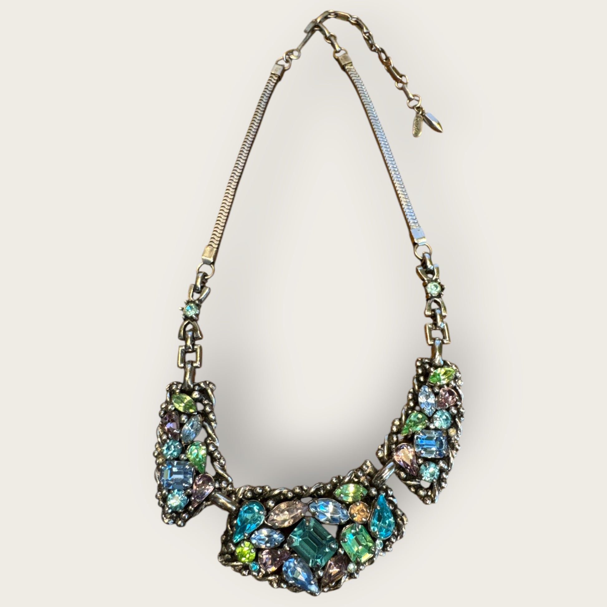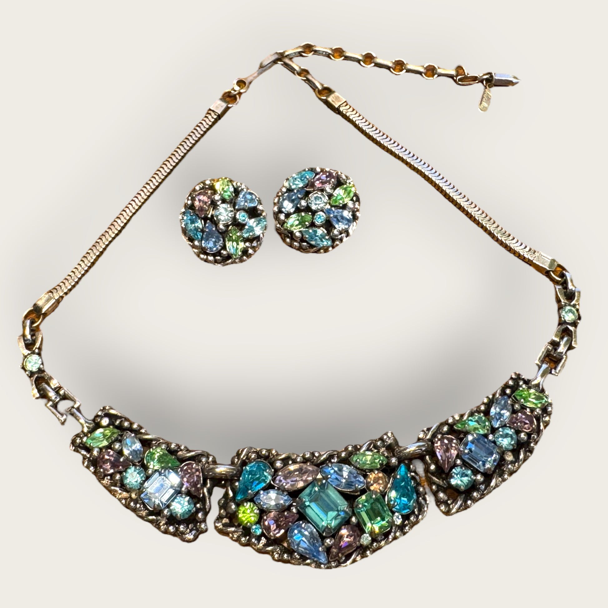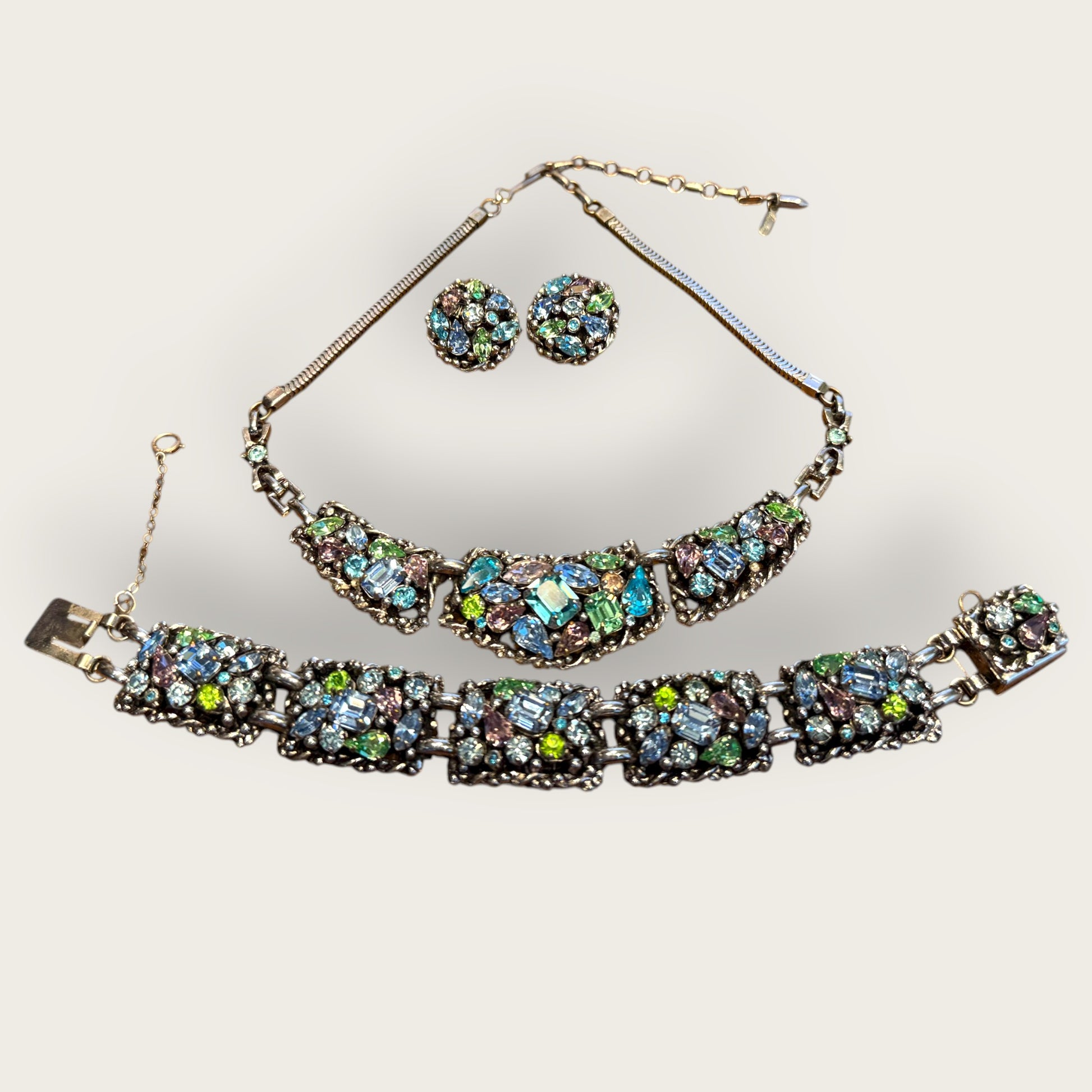 Barclay’s parures from the 1950s represent a golden age of costume jewelry — a time when craftsmanship rivaled fine jewelry houses. This uranium rhinestone suite is exceptionally rare, offering both aesthetic beauty and collectible intrigue. The ethereal glow, layered color story, and commanding presence make it a coveted centerpiece for serious collectors of mid-century design and Hollywood Regency adornment.