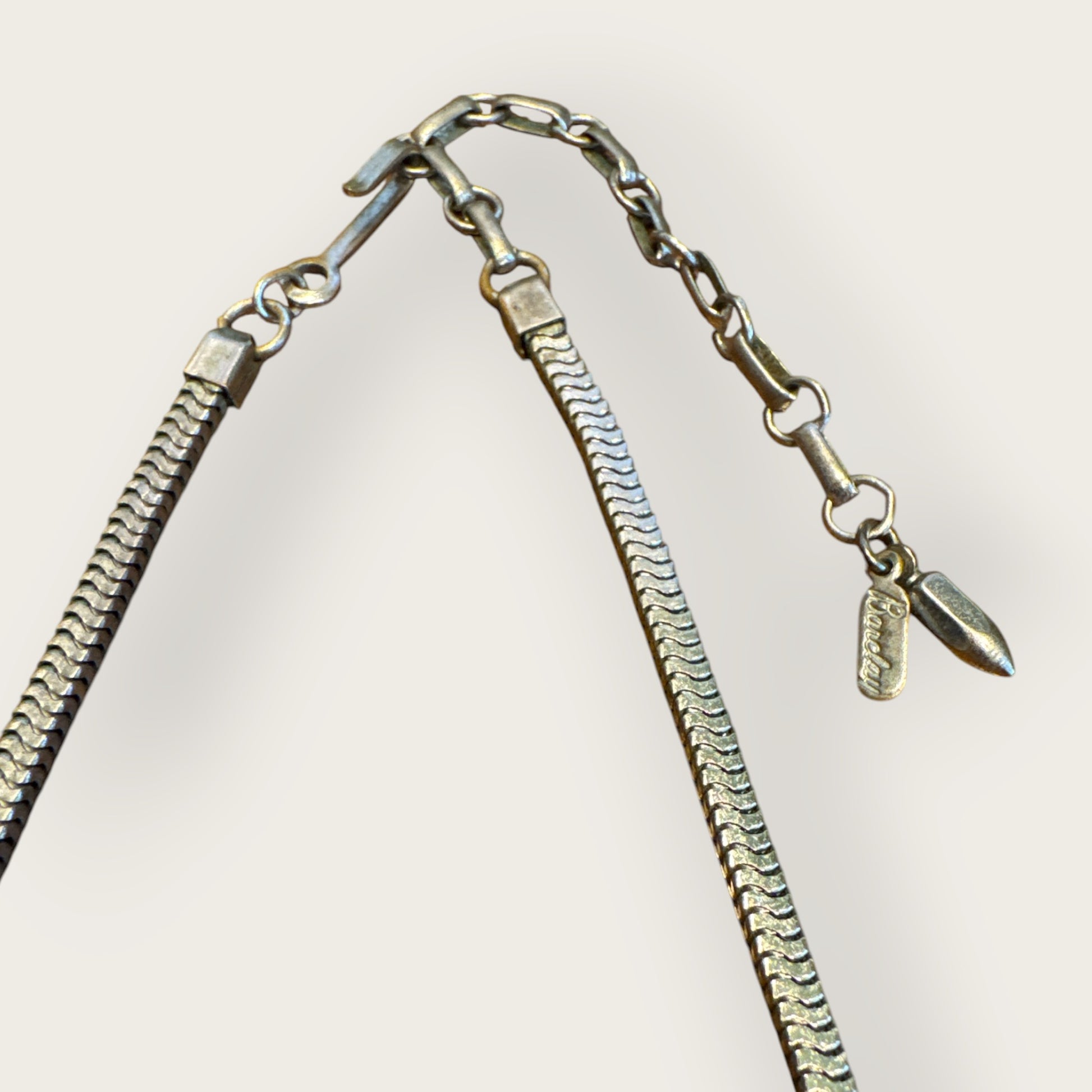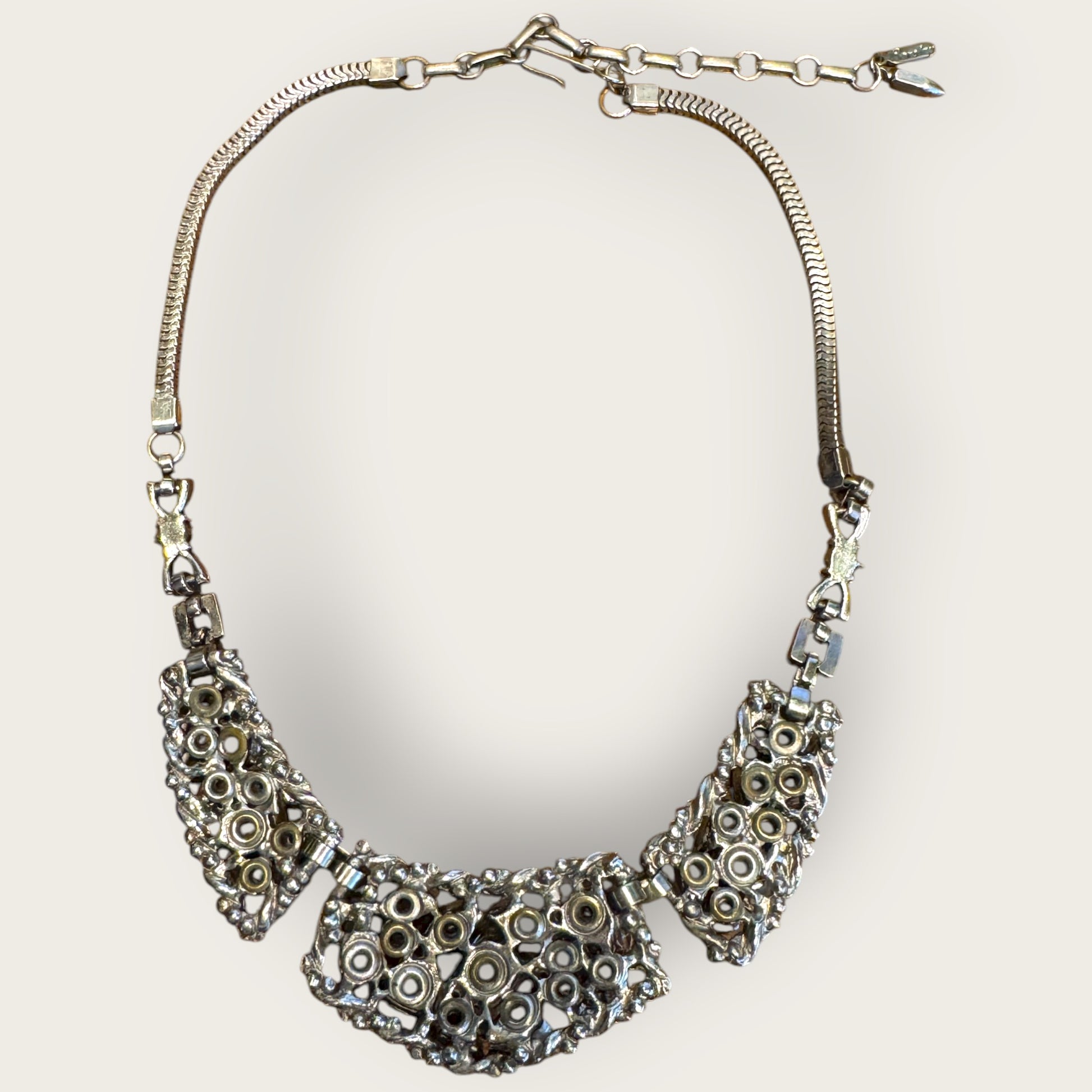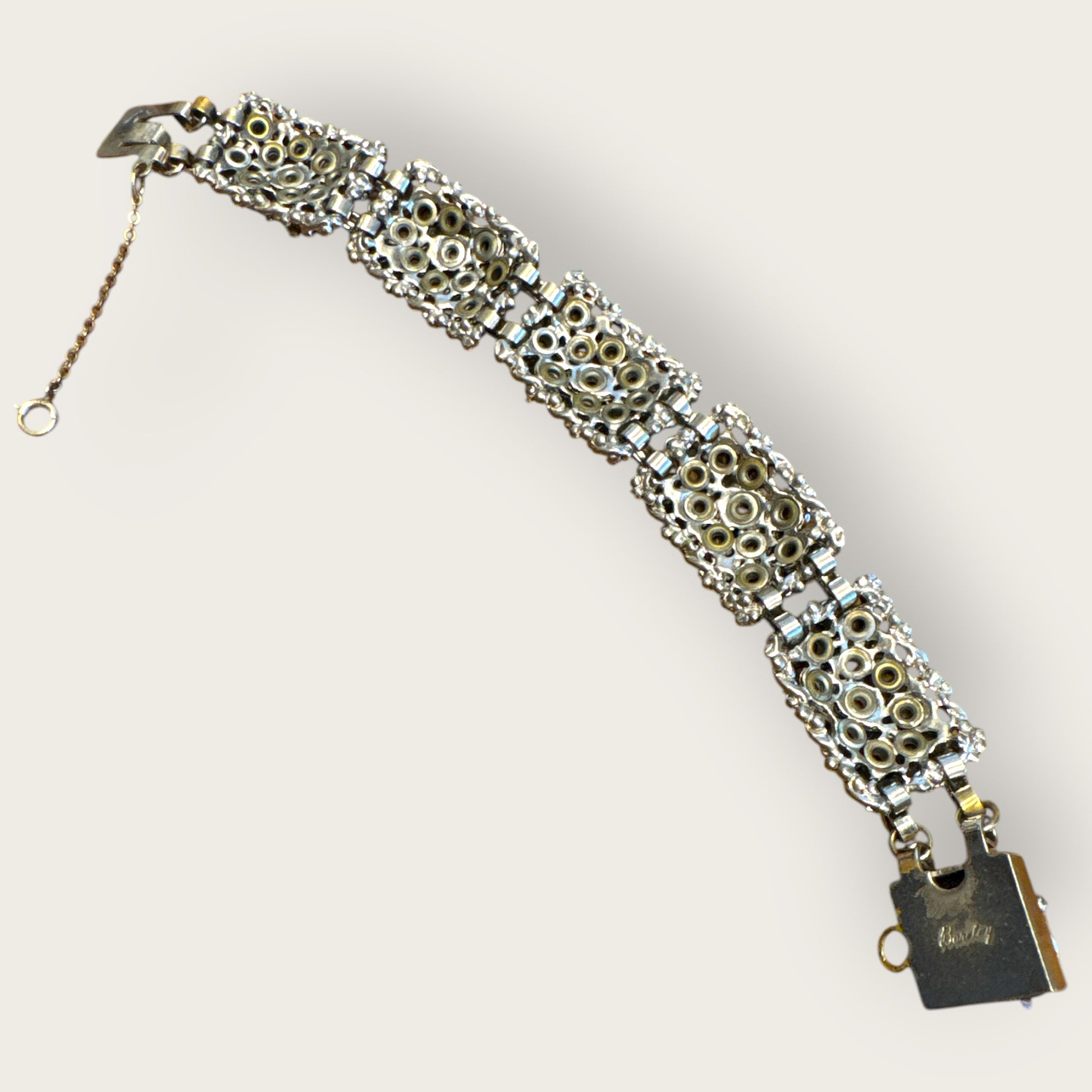 Crafted in silver-tone metal with intricate raised panelwork and meticulous stone placement, this parure reflects the designer’s unmistakable mid-century craftsmanship. Elegant yet bold, it embodies the glamour of 1950s couture jewelry — designed to make an unforgettable impression.