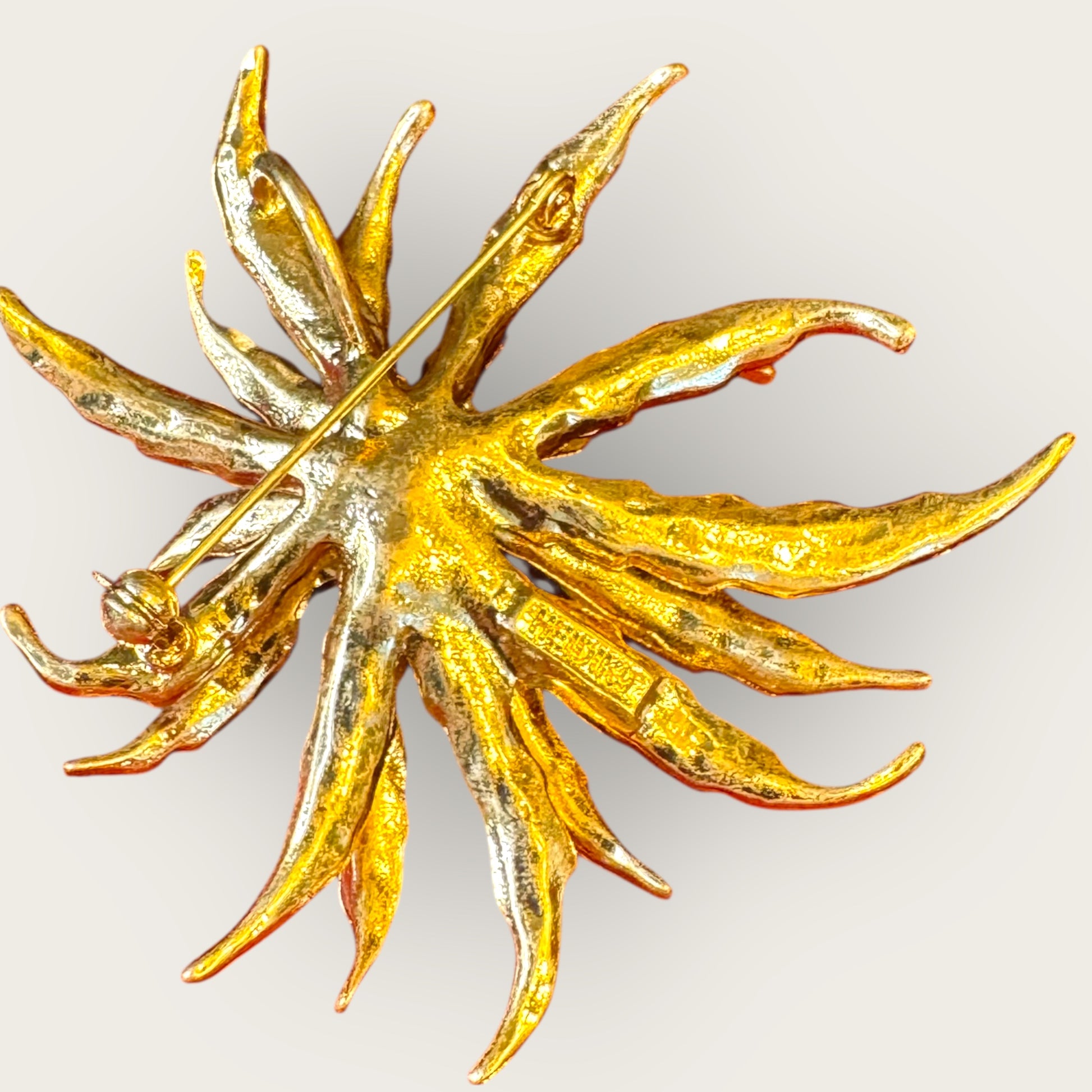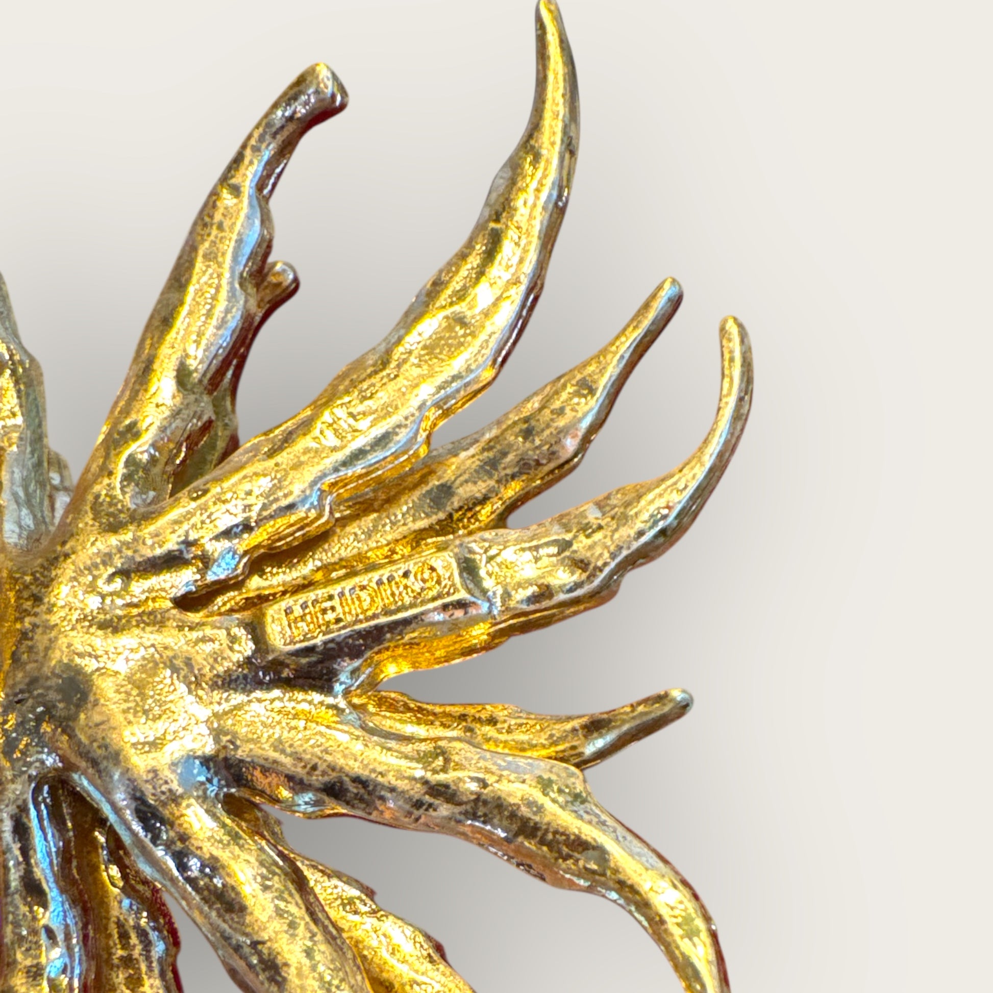 Vintage Signed HEIDIK9 Statement Floral Brooch & Pendant – Sculpted Gold Sunburst with Emerald Rhinestone Center