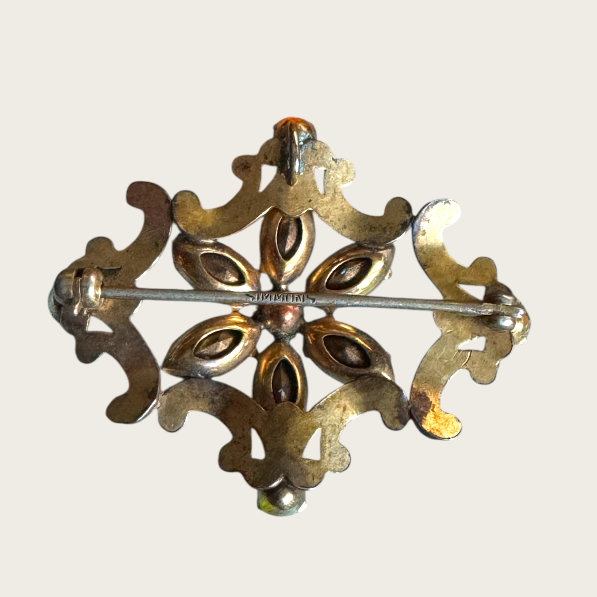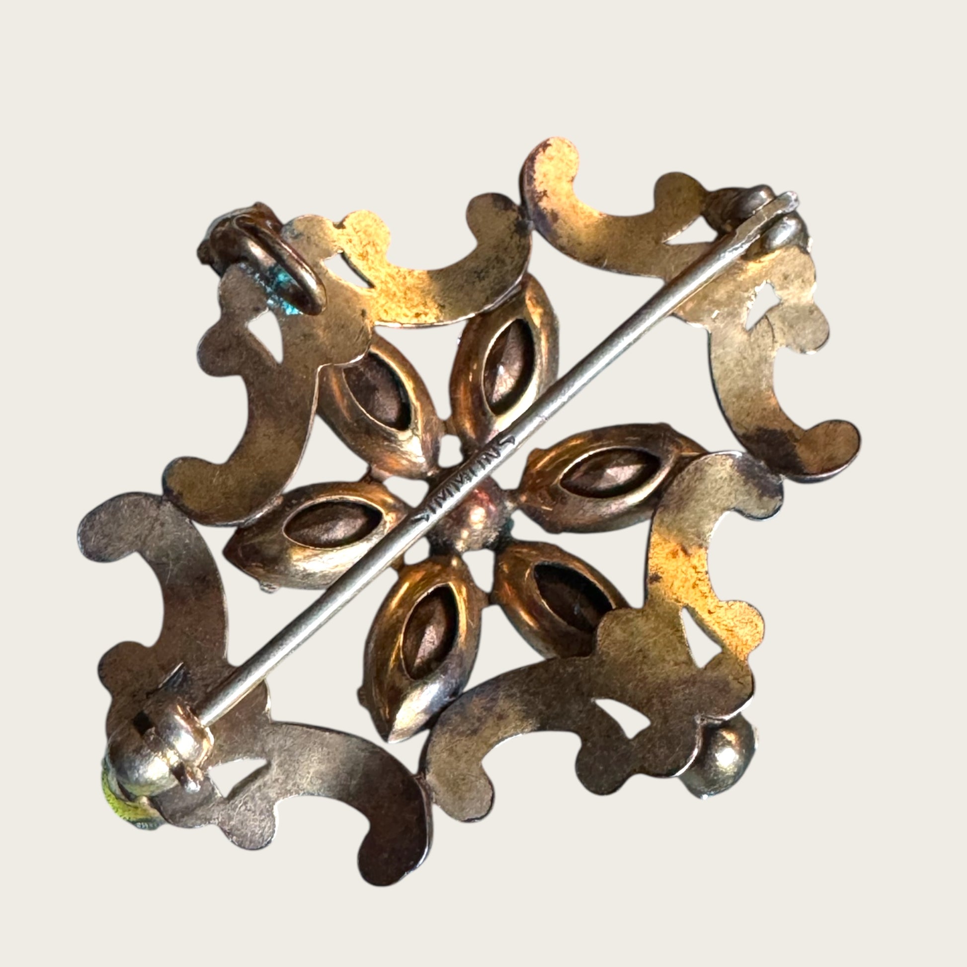 Marked Simmons on the pin stem, this piece reflects the company’s transition from fine gold-filled accessories to elegant costume jewelry during the postwar years. It’s a convertible design that can be worn as both a brooch and pendant, offering timeless versatility for collectors and vintage jewelry lovers alike.