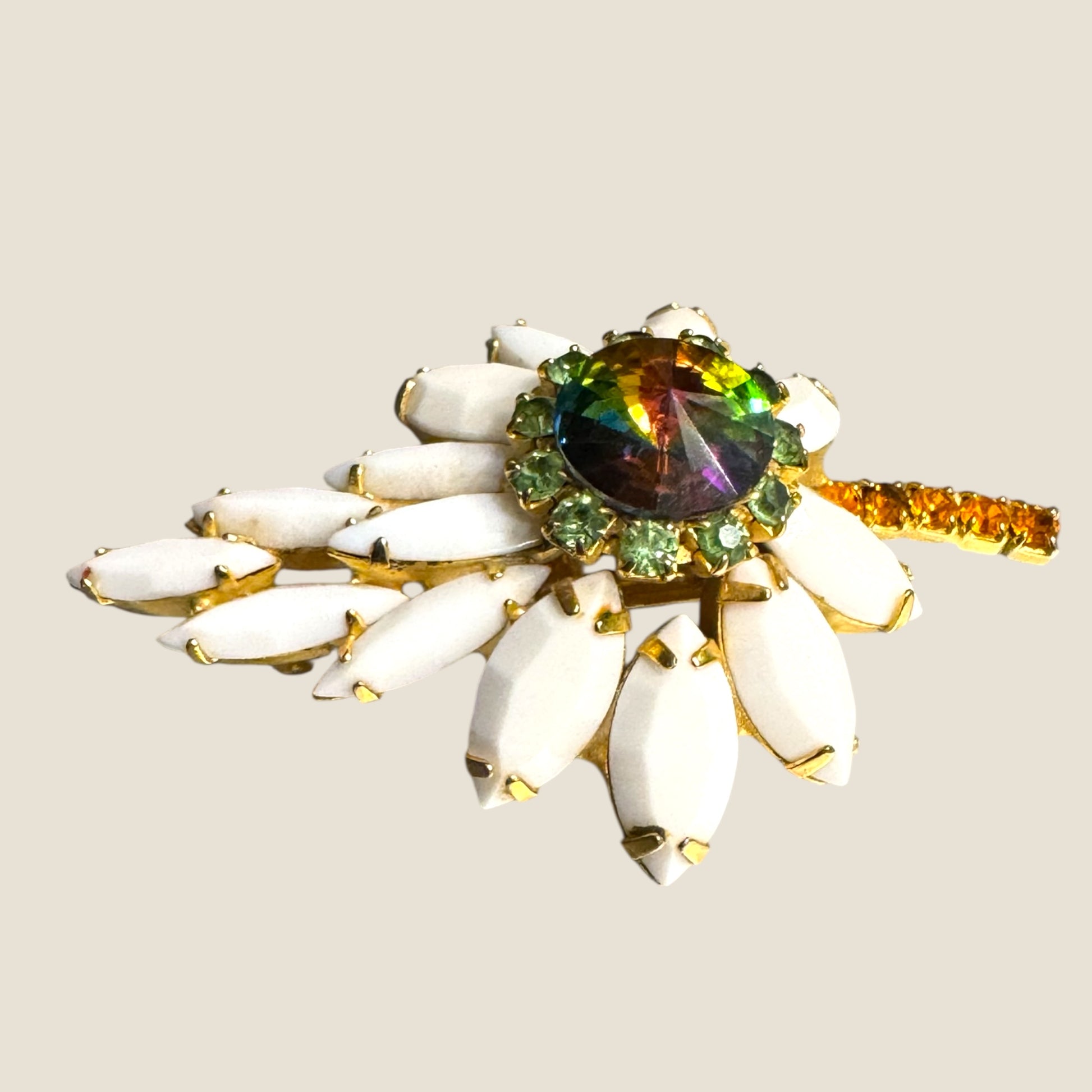 Capture luminous mid-century elegance with this breathtaking floral brooch, centered around a brilliant watermelon AB Rivoli stone that flashes vibrant green, gold, and rose when it catches the light. Surrounding the Rivoli is a halo of sparkling peridot chatons, prong-set to perfection for maximum clarity and brilliance.