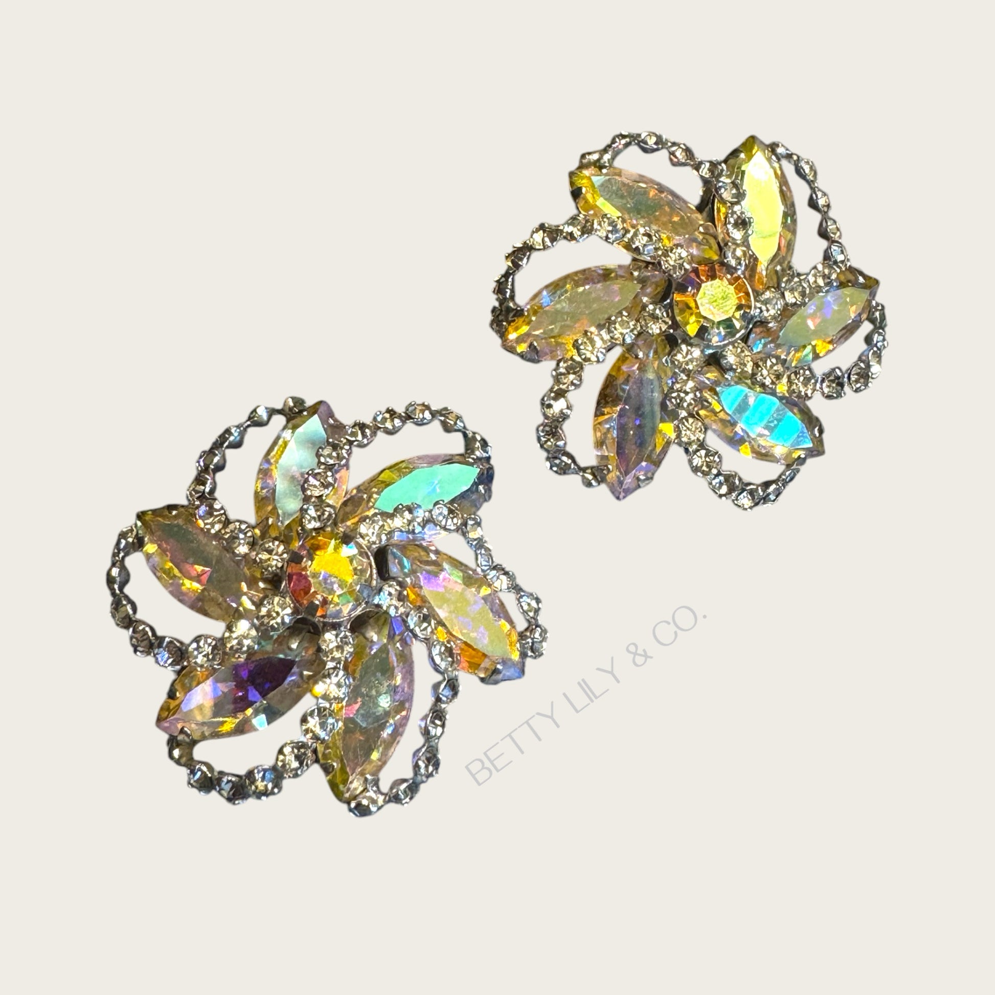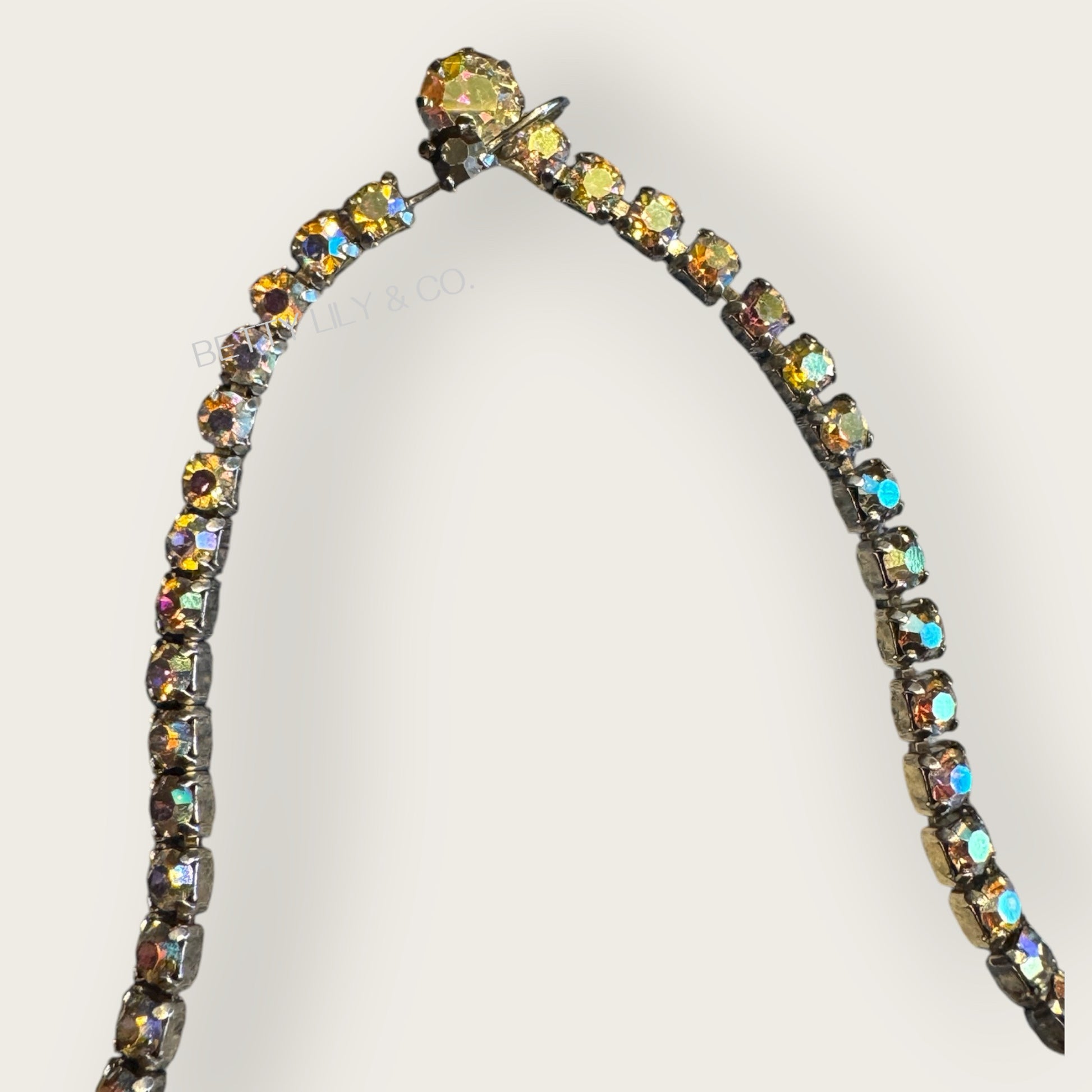 A breathtaking mid-century aurora borealis parure by Weiss, preserved in exceptional condition and offered from Betty’s personal collection. This four-piece suite showcases the iconic brilliance of 1950s–early 1960s Weiss design: layered navette and rivoli stones in silver-tone settings, multi-row construction, and the unmistakable fire of hand-set AB crystal.